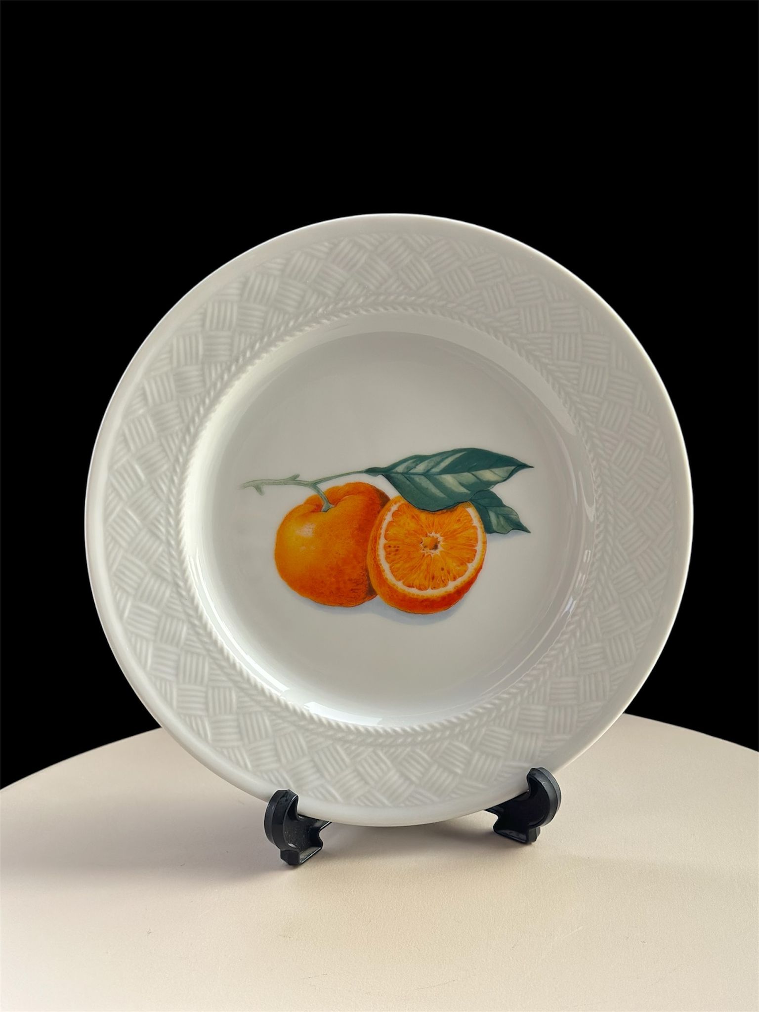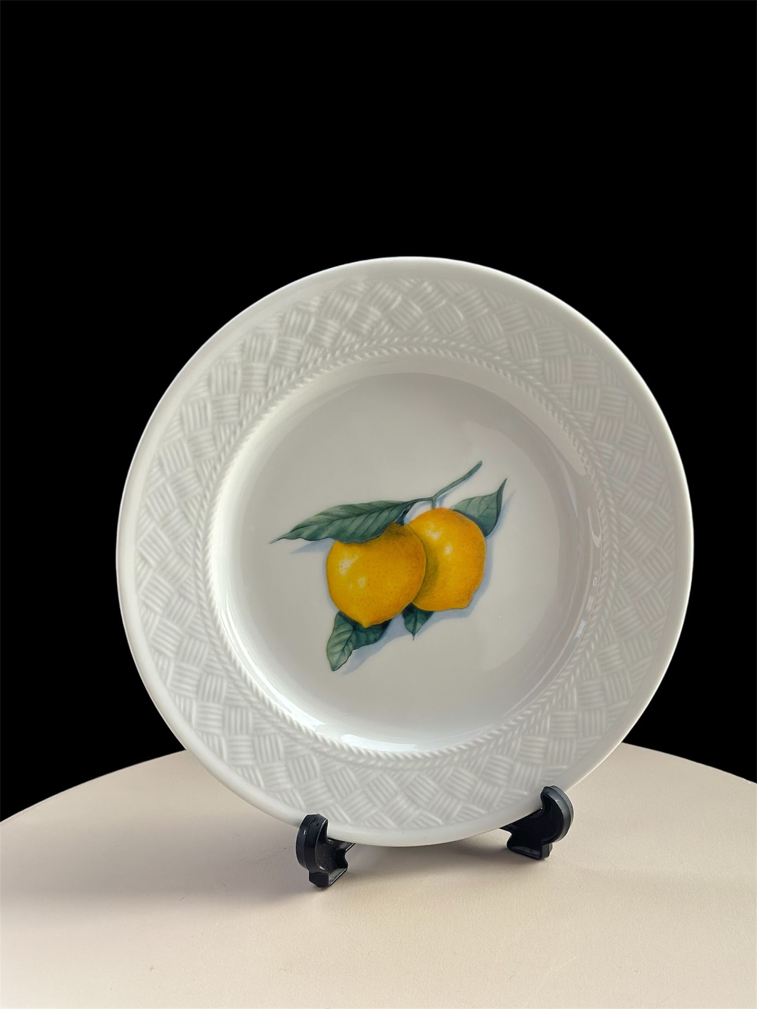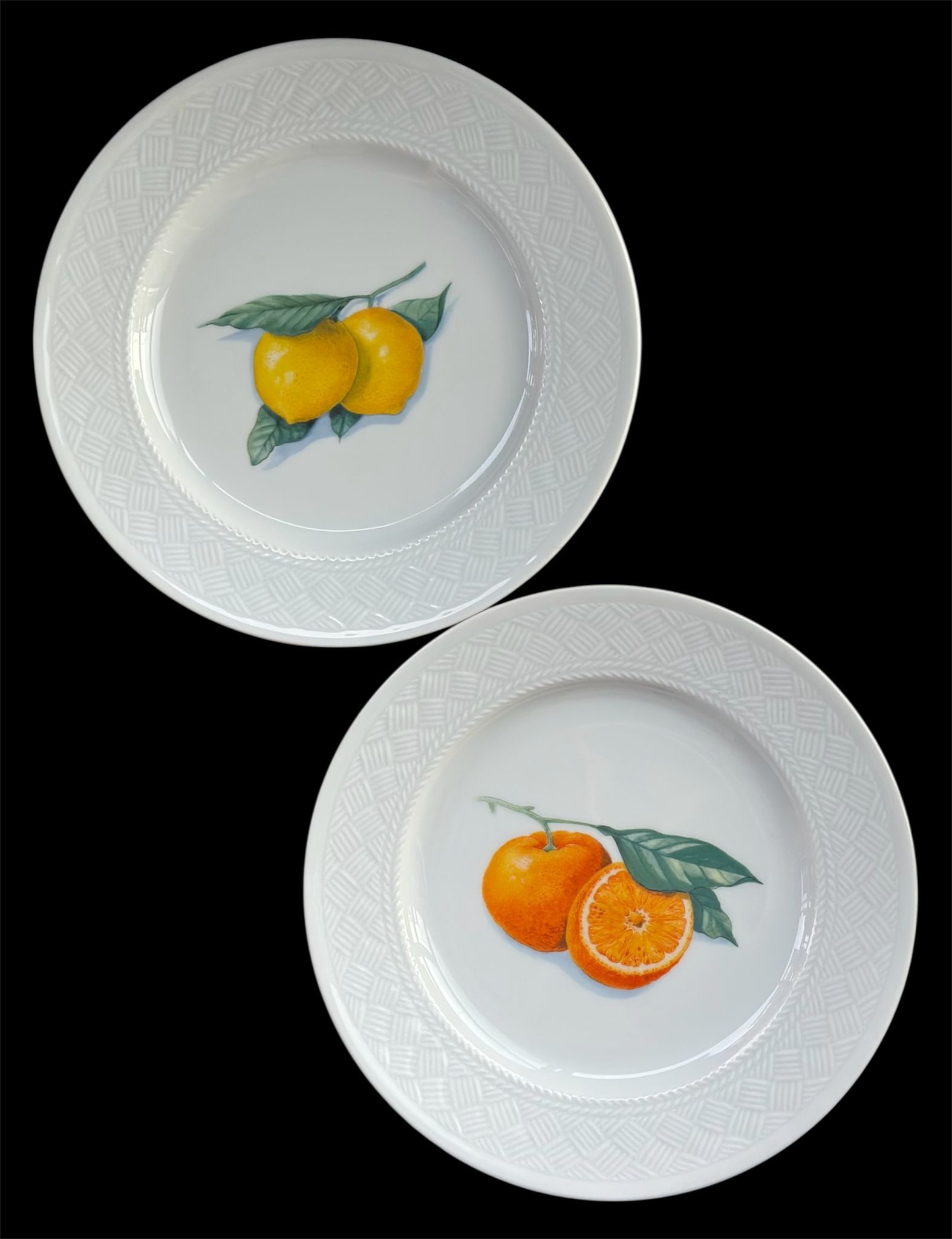 Each plate features a stunning, vibrant botanical illustration—one showcasing citrus Lemons and the other Oranges. The design is elegantly framed by a sophisticated embossed basketweave border and a delicate rope-edge detail, characteristic of premium English porcelain.