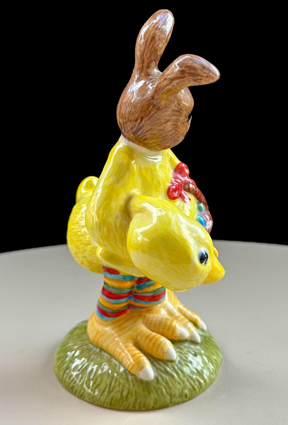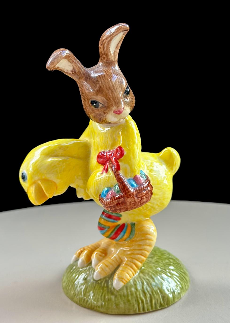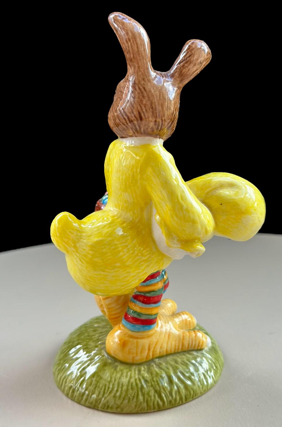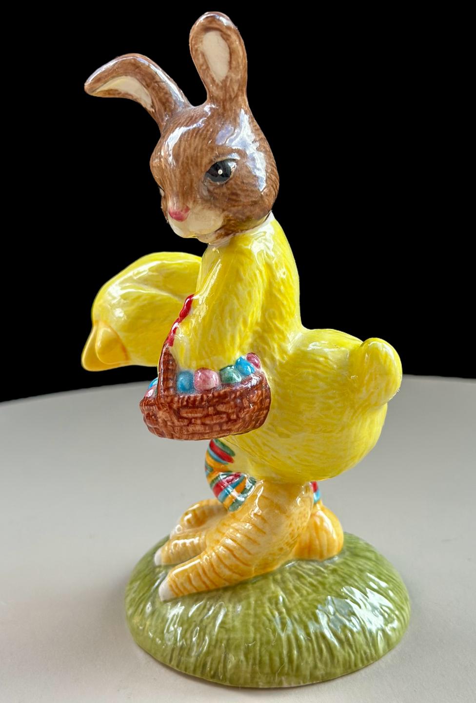 This delightful Royal Doulton Bunnykins “Easter Parade” DB292 figurine features a Bunnykins rabbit dressed in a vibrant yellow chick costume, holding a basket filled with Easter eggs. The figure captures the festive spirit of Easter parades, beautifully hand-painted with intricate details.