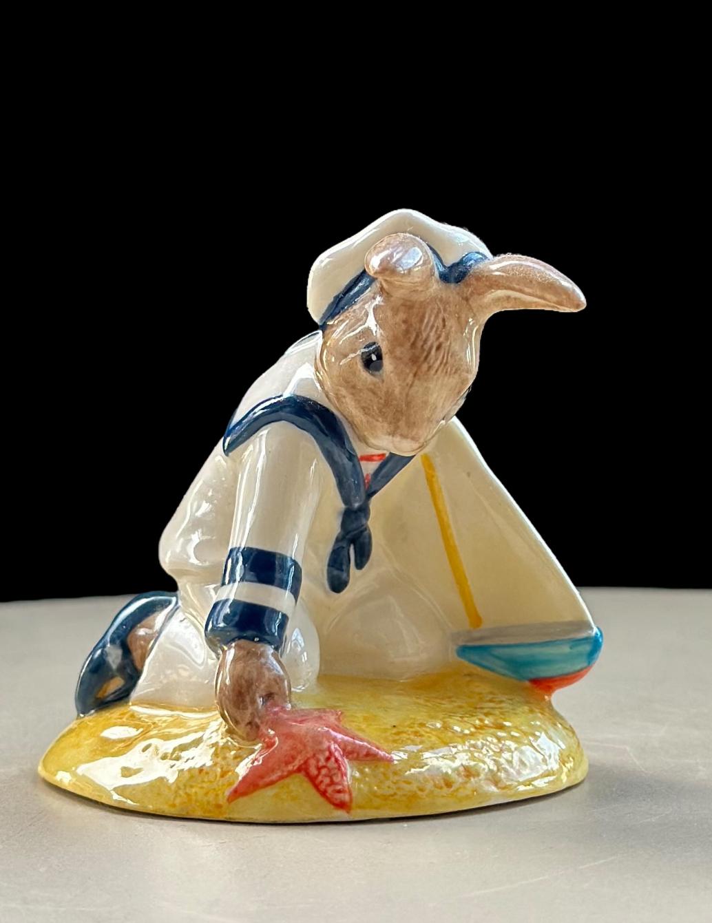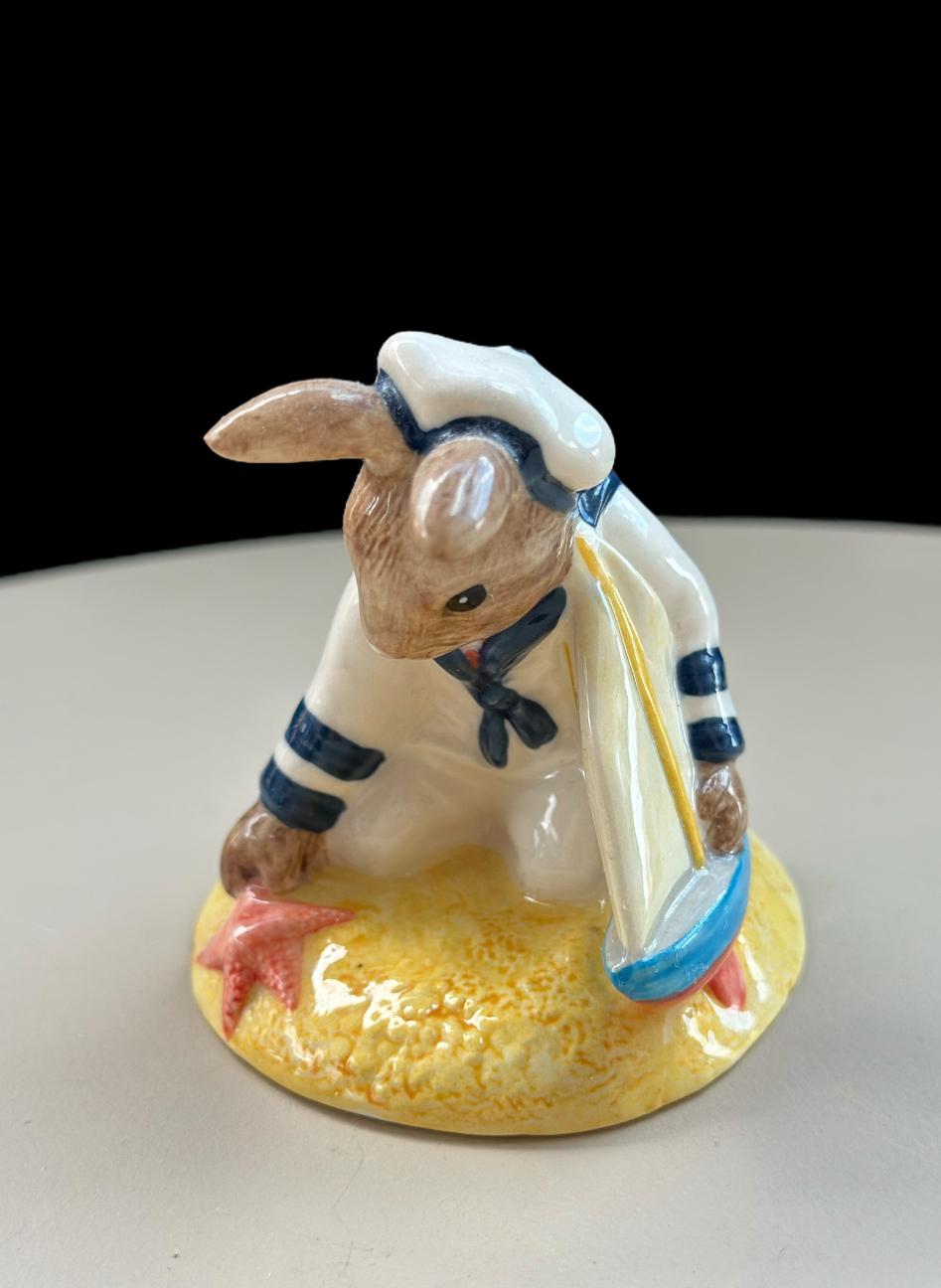 A charming Royal Doulton Bunnykins figure commonly listed as “Sailor” (DB166). This limited-piece Bunnykins of the Year release features a small Bunnykins rabbit in a sailor-style top, posed on a sandy base with seaside details — a fine example of Royal Doulton hand-painted craftsmanship and a collectible release from the late 1990s.