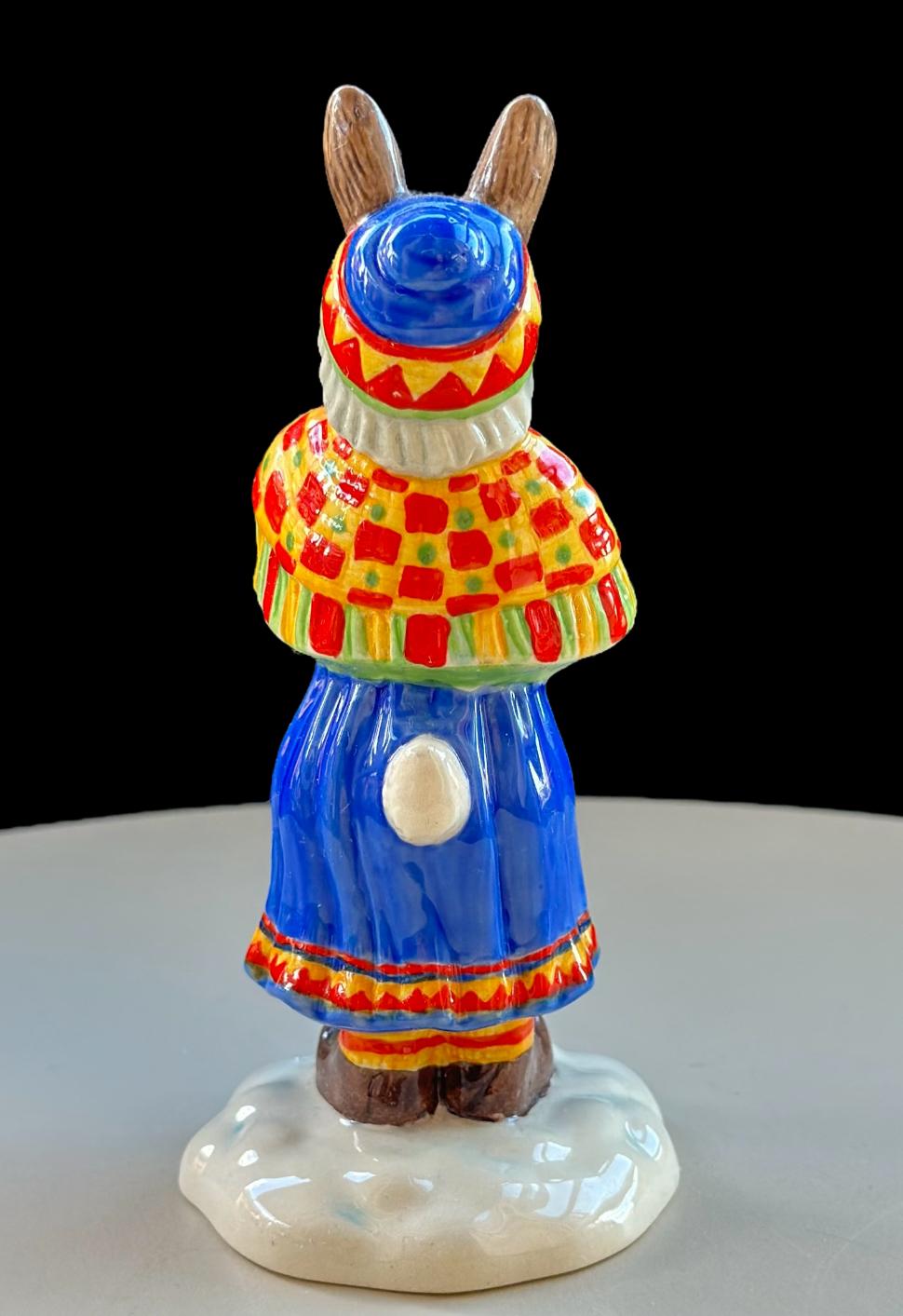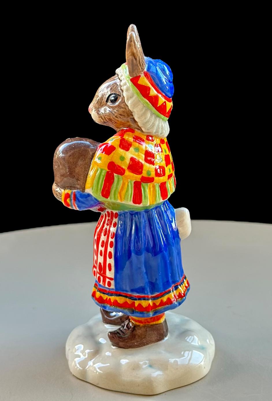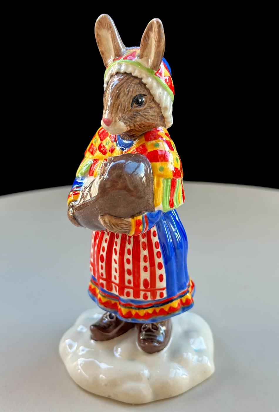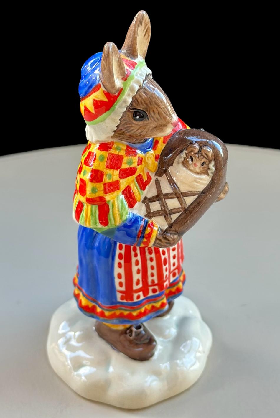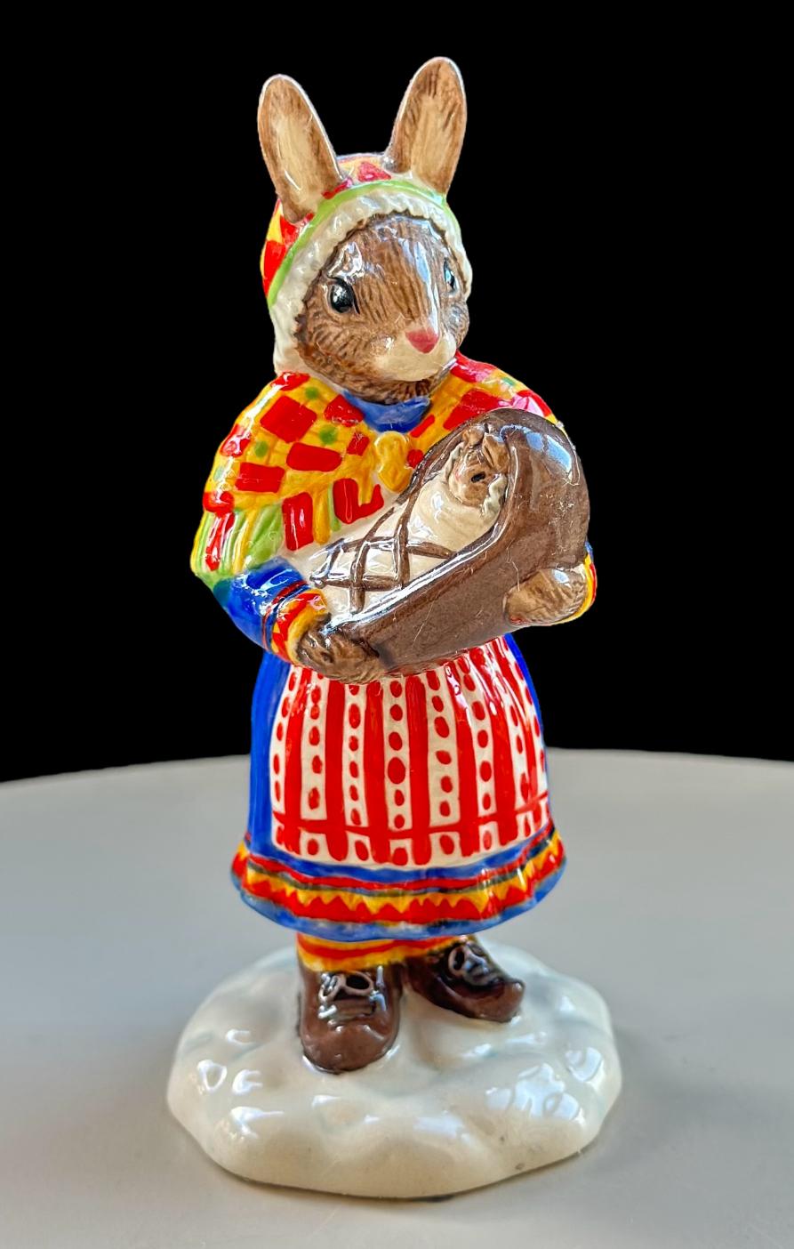 This charming Royal Doulton Bunnykins “Summer Lapland” DB298 figurine depicts a Bunnykins rabbit dressed in traditional Sami attire, holding a basket with a tiny Bunnykins baby inside. The figure captures a sweet, heartwarming scene of care and tradition, beautifully hand-painted with intricate details.
