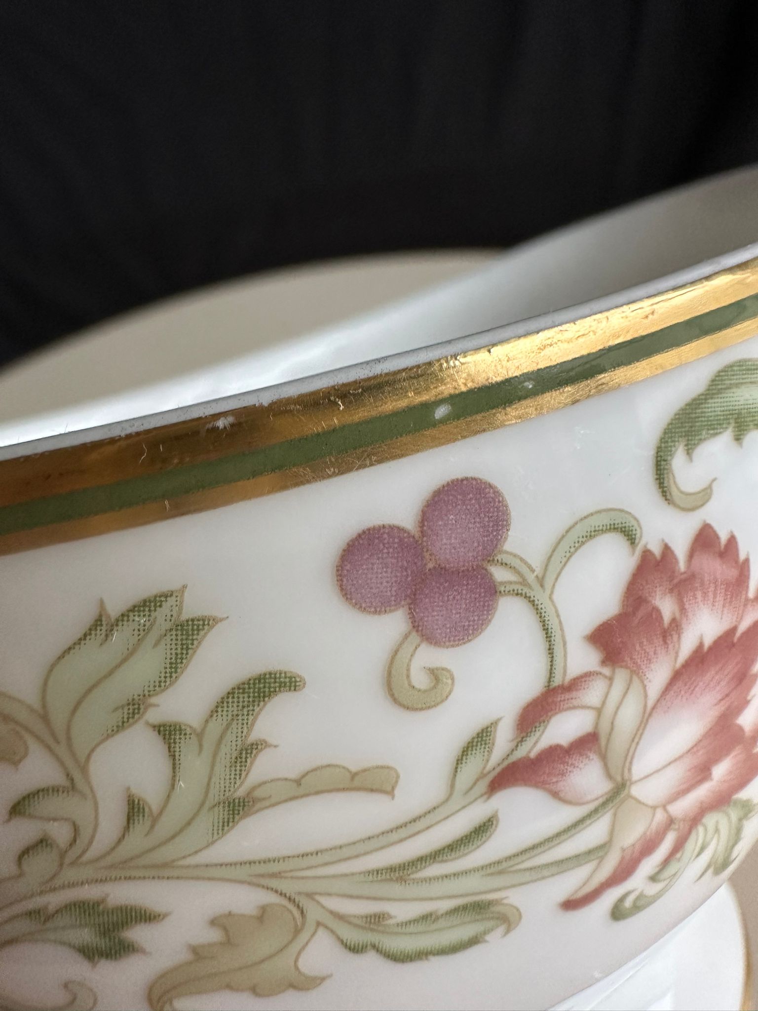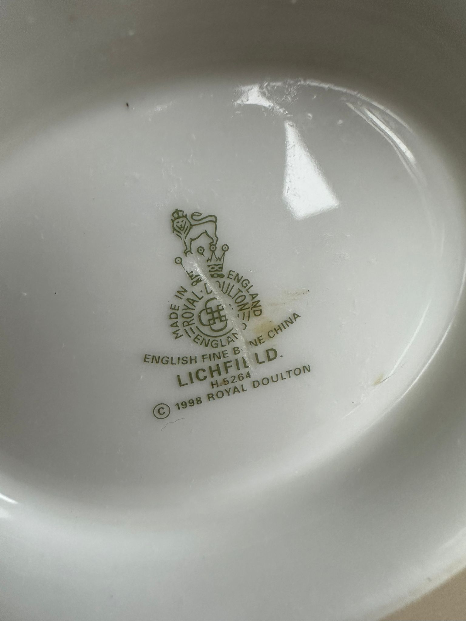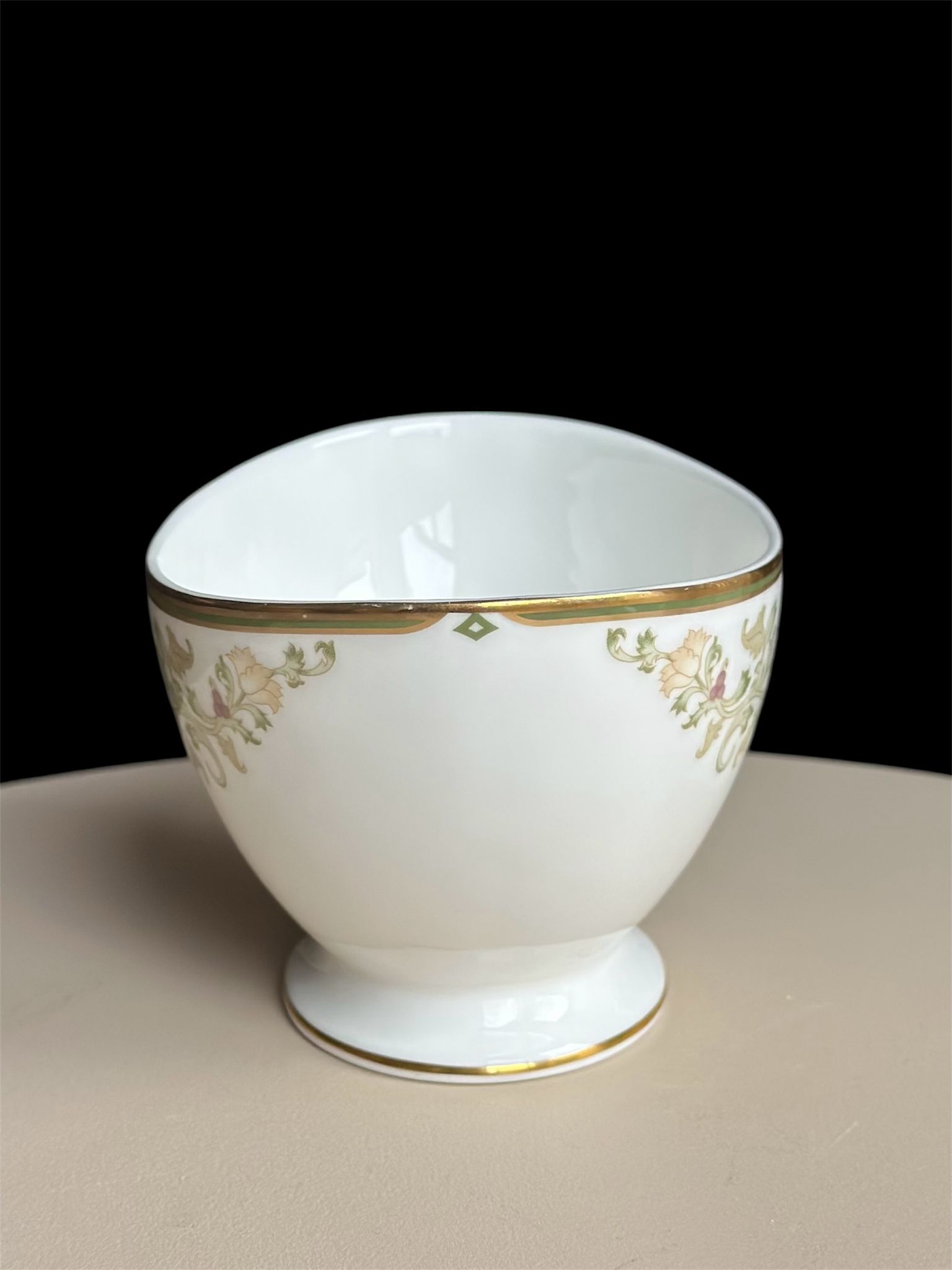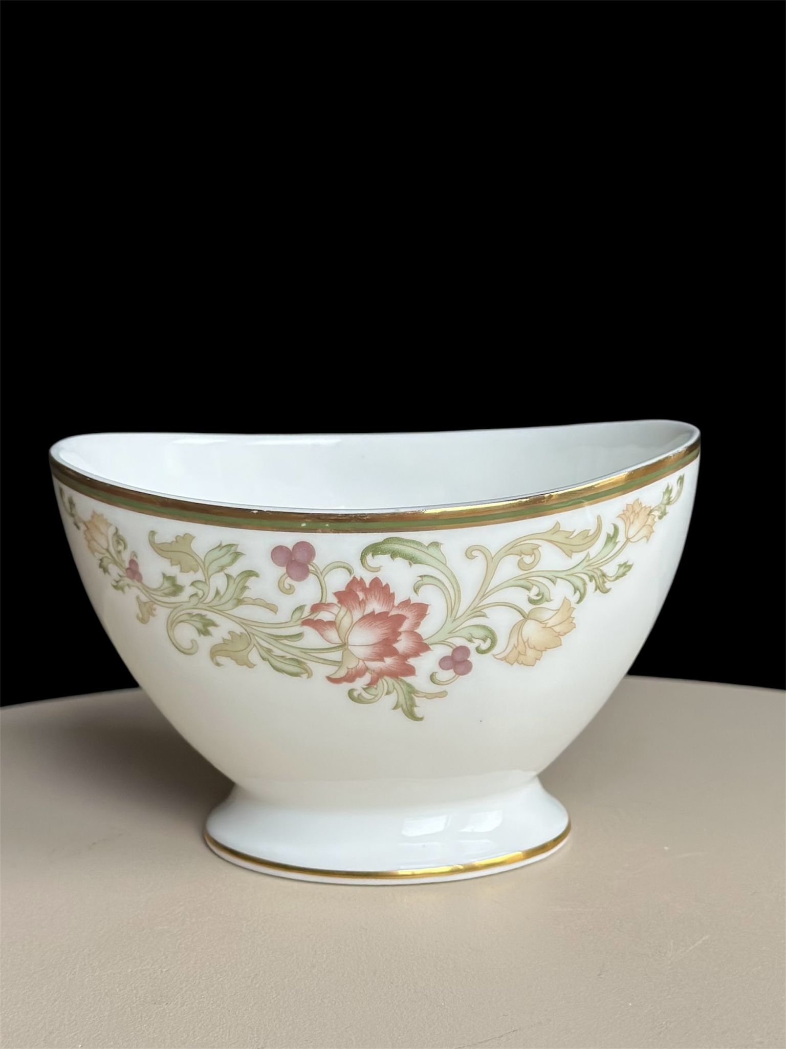 Royal Doulton “Lichfield” (H5264) open sugar bowl. Produced in 1998, this pattern features a delicate floral scroll design in muted earth tones, pinks, and greens, finished with a refined gold-gilded rim.