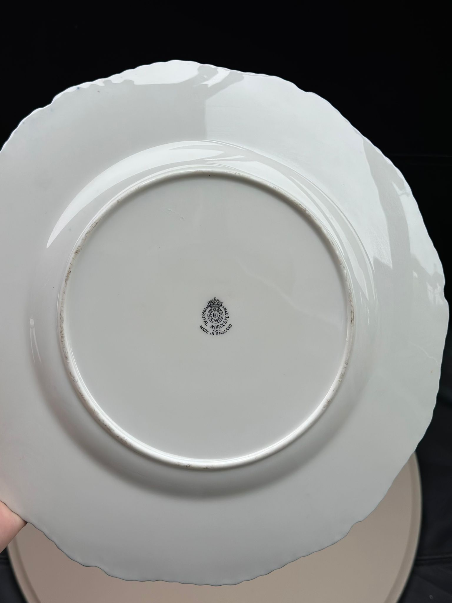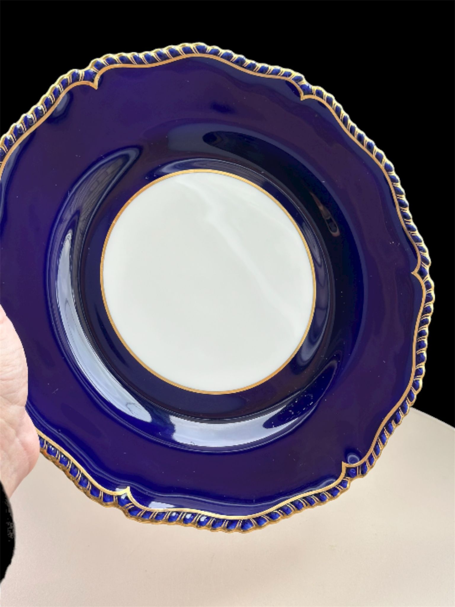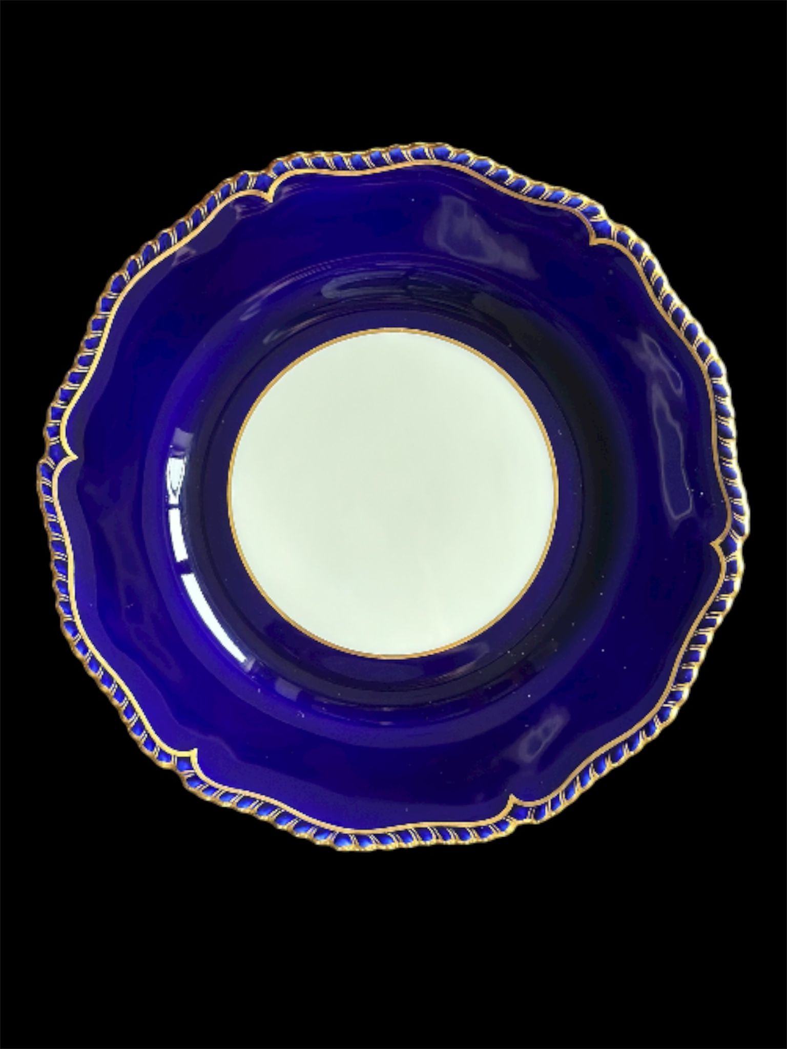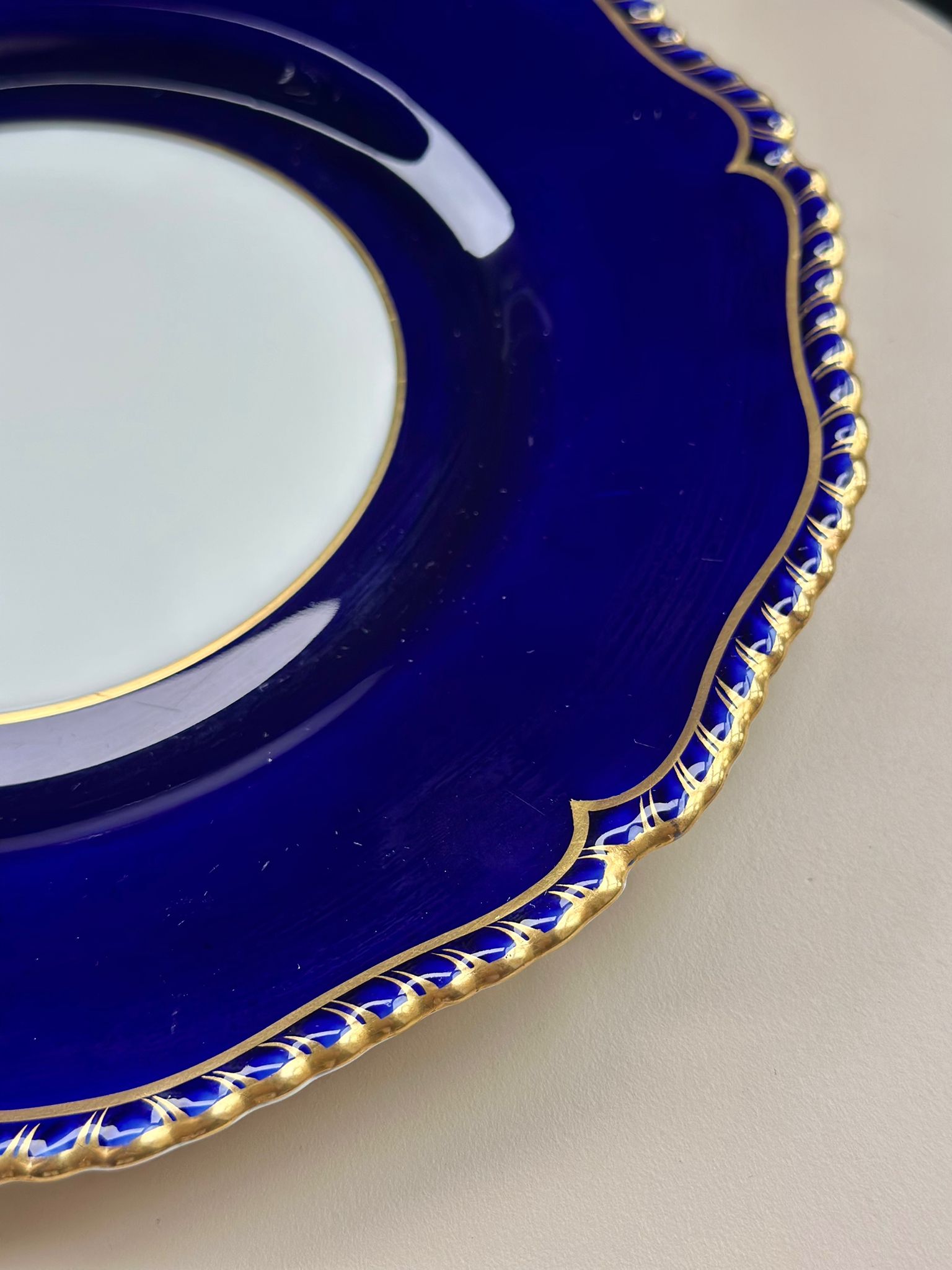 This stunning Royal Worcester vintage dinner plate features a rich cobalt blue border accented with elegant gold detailing and scalloped edges. Crafted from fine bone china and made in England, this collectible plate embodies timeless British craftsmanship and sophistication.