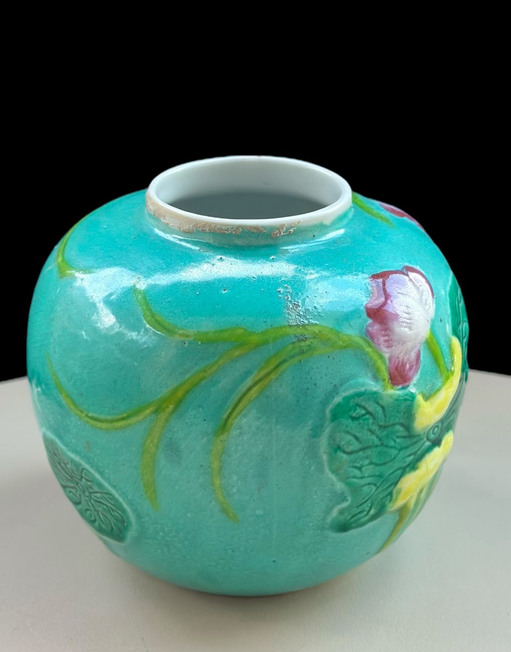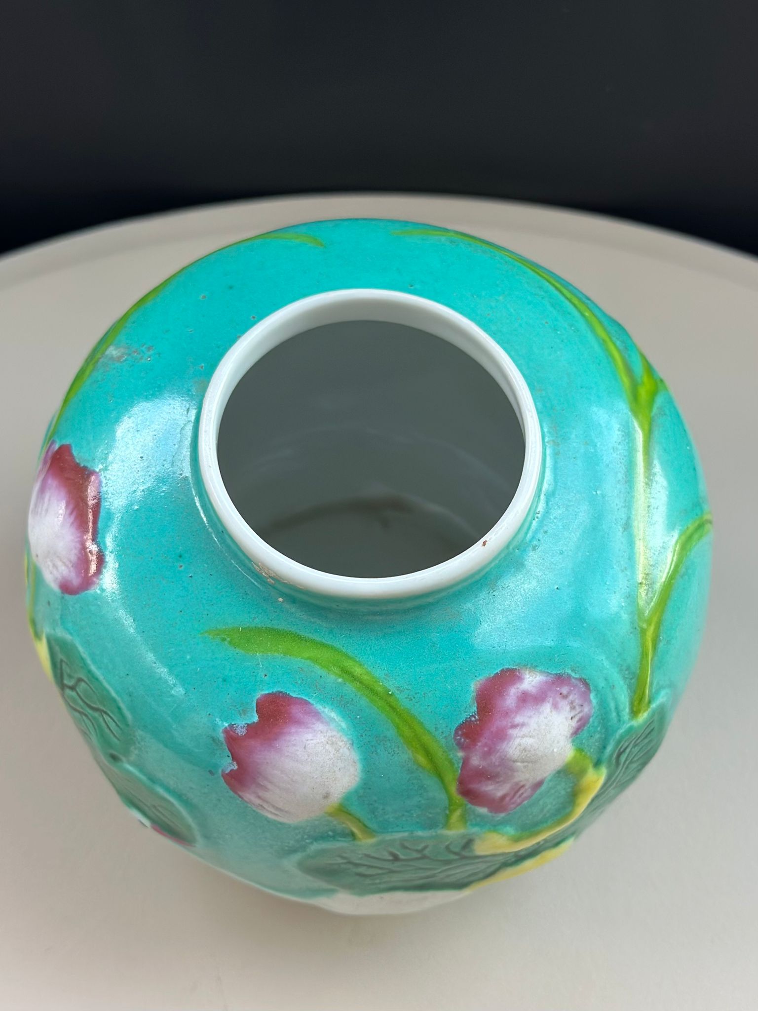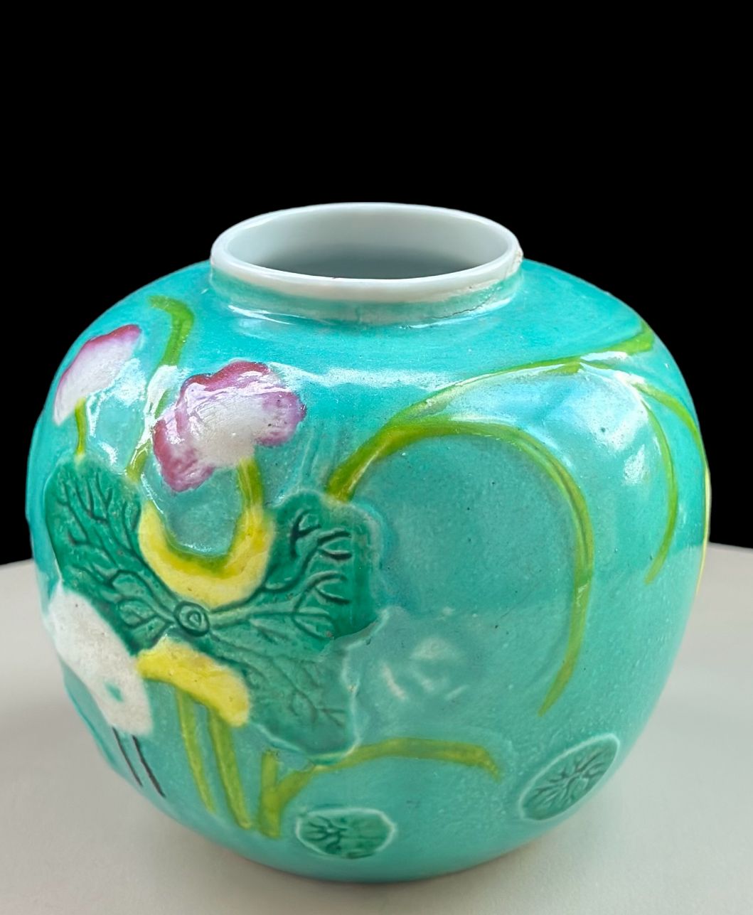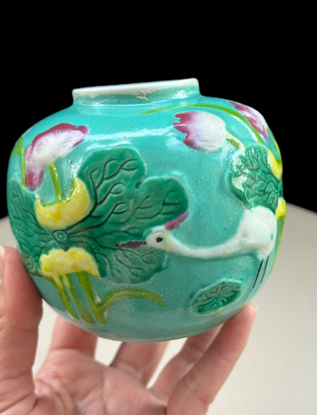 Feel the texture of the raised design—the elegant, white crane standing amidst the lush lotus blossoms. This isn’t just pottery; it’s a piece of art that invites you to look closer. The quality of the relief work and the hand-painted enamels speak to the mastery of the artisans.
