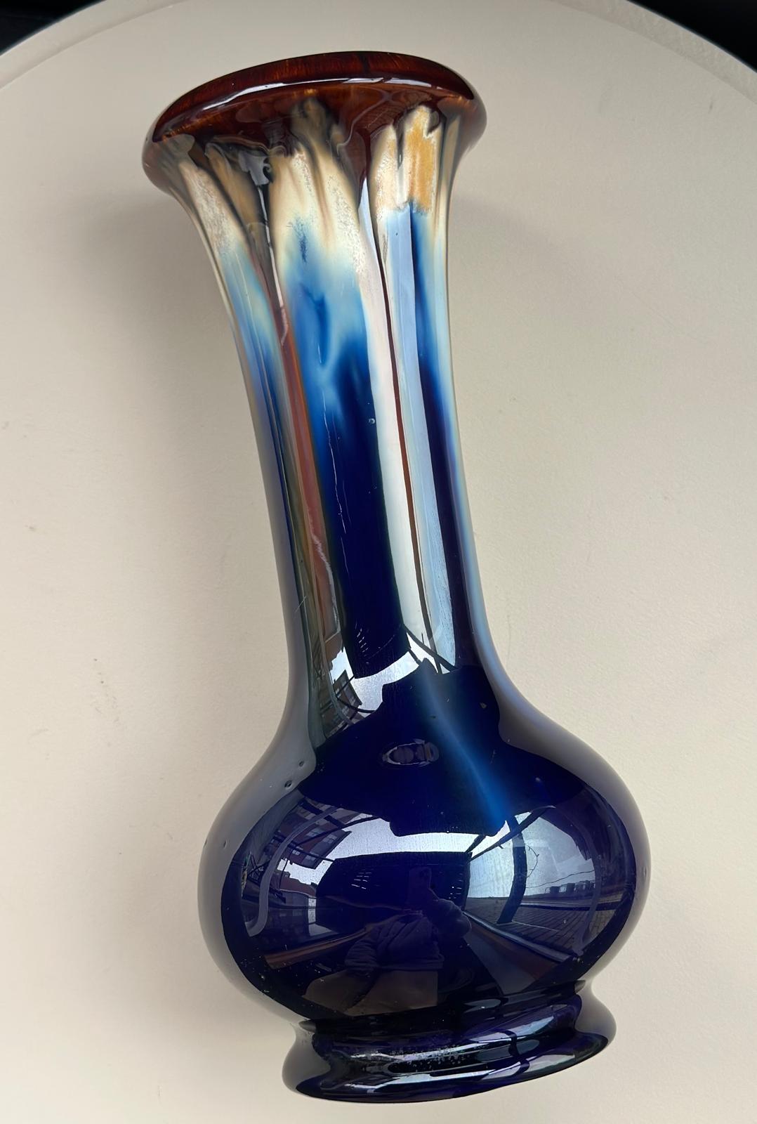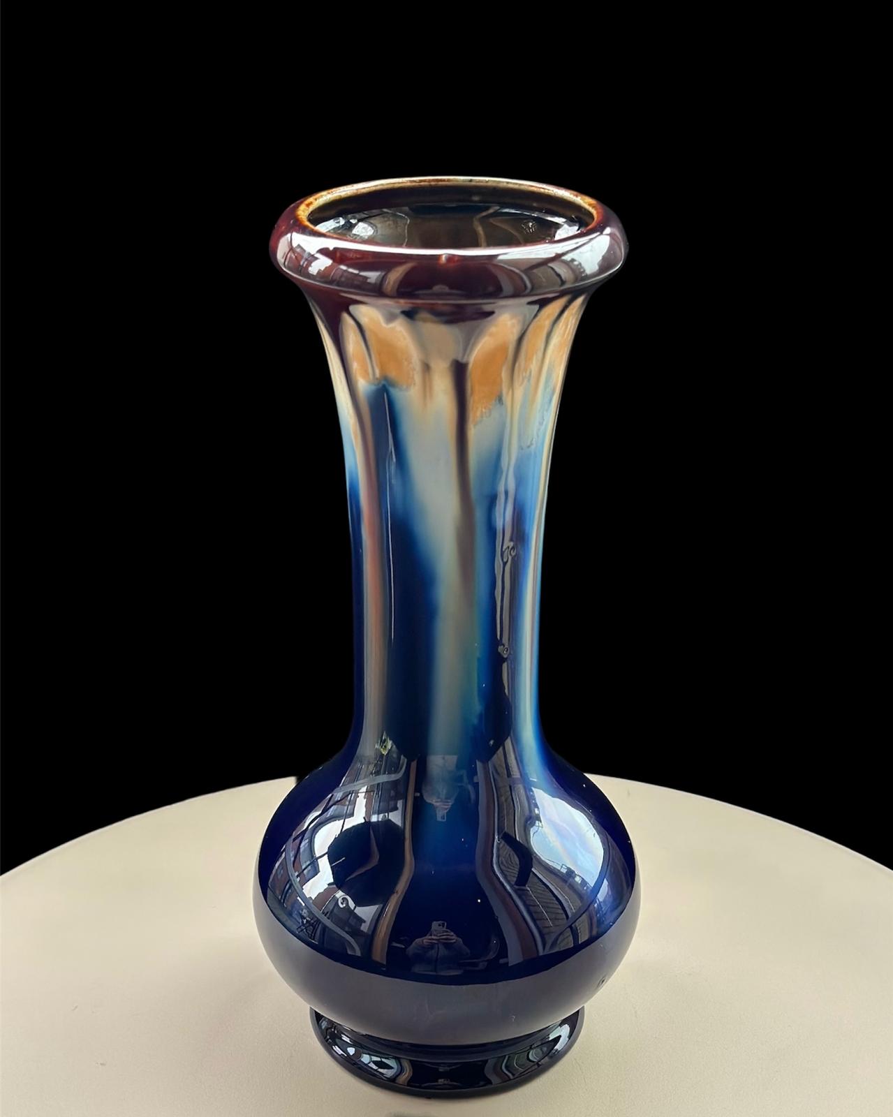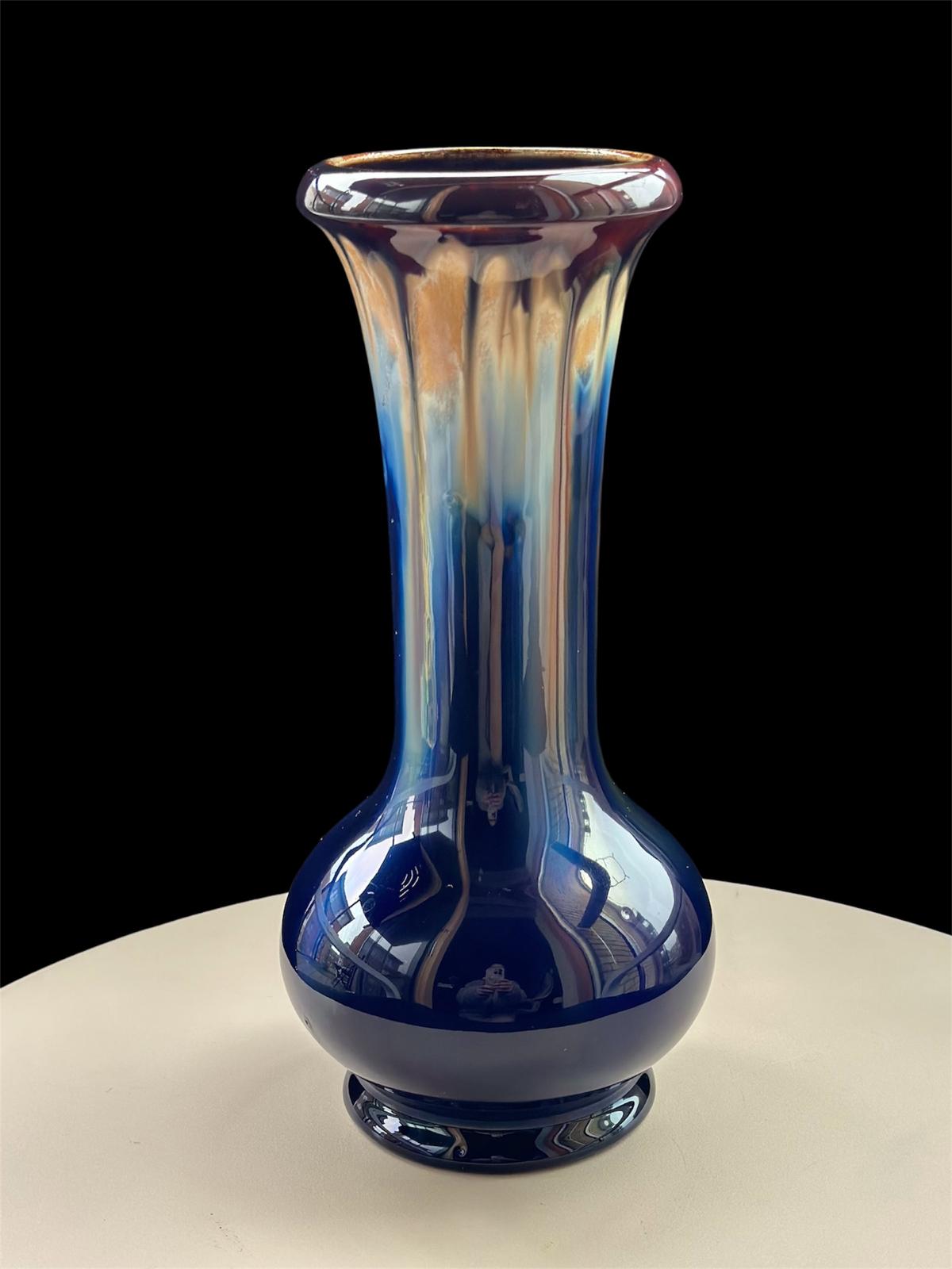 Up for sale is a gorgeous piece of mid-century Belgian ceramics. This elegant vase features a striking “drip glaze” (flambé) finish, where deep cobalt blue transitions into warm amber and creamy tones at the rim.