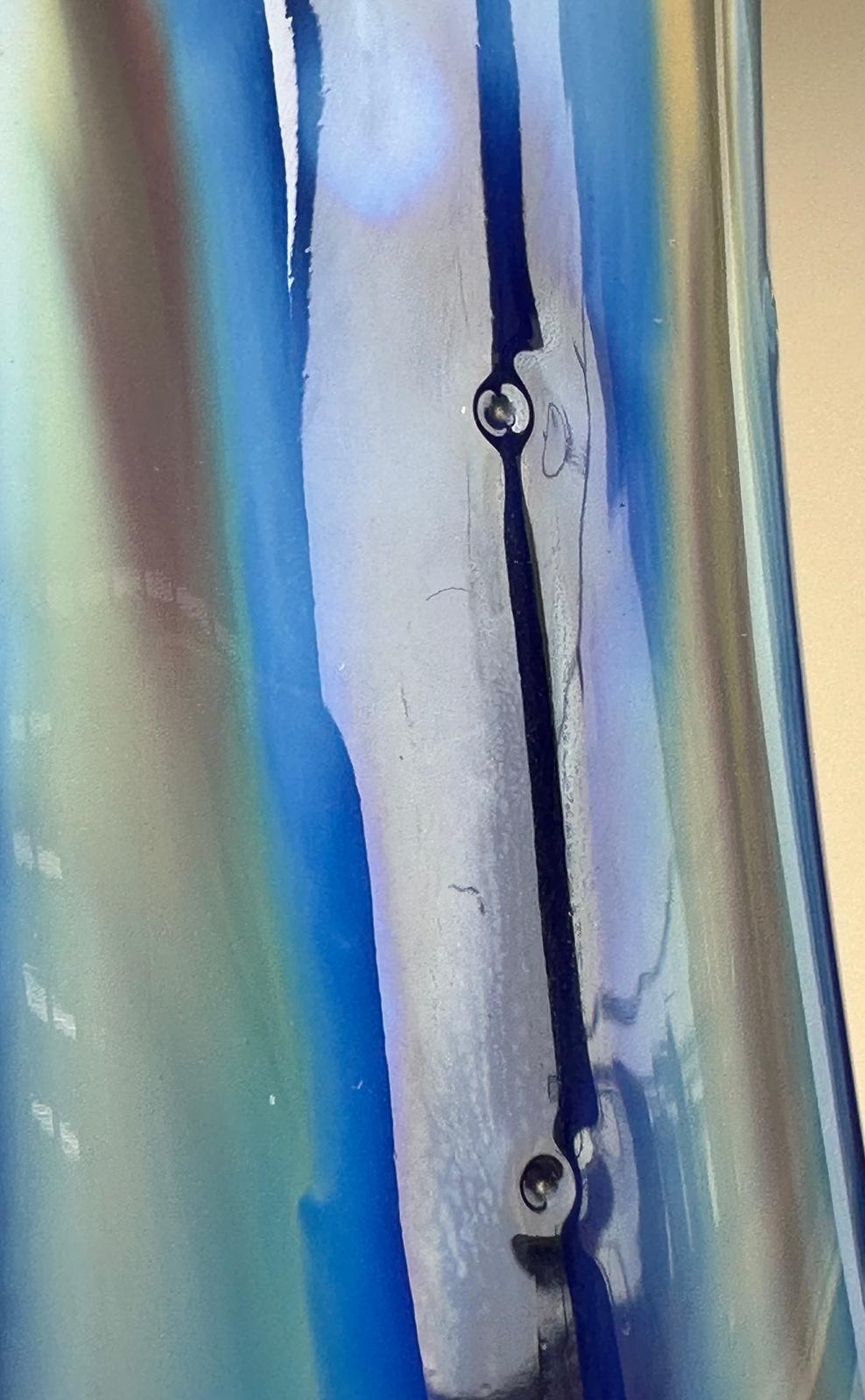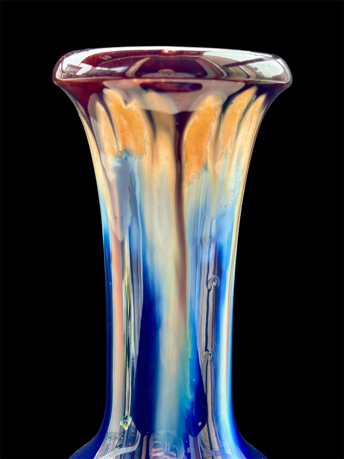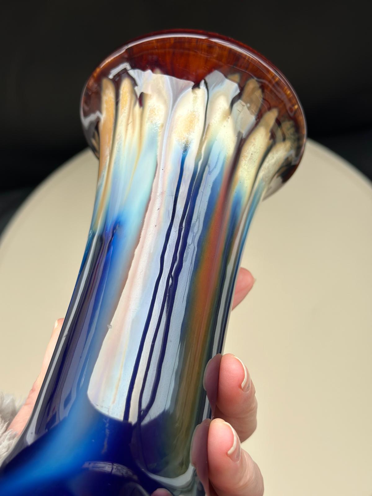 Up for sale is a gorgeous piece of mid-century Belgian ceramics. This elegant vase features a striking “drip glaze” (flambé) finish, where deep cobalt blue transitions into warm amber and creamy tones at the rim.