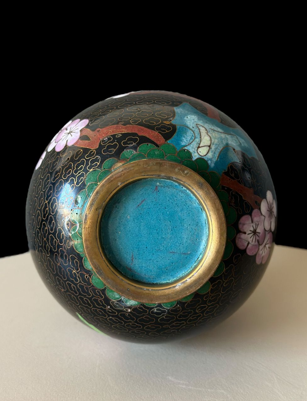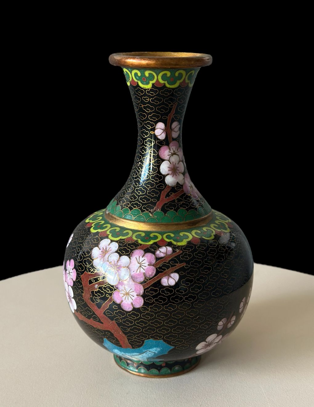 This beautiful vintage cloisonné vase features a striking black enamel body adorned with delicate pink cherry blossoms. The intricate golden wirework creates a swirling cloud pattern, while colorful bands of green, red, and yellow decorate the neck and base. A perfect piece to add a touch of Asian-inspired elegance to any shelf or mantel.