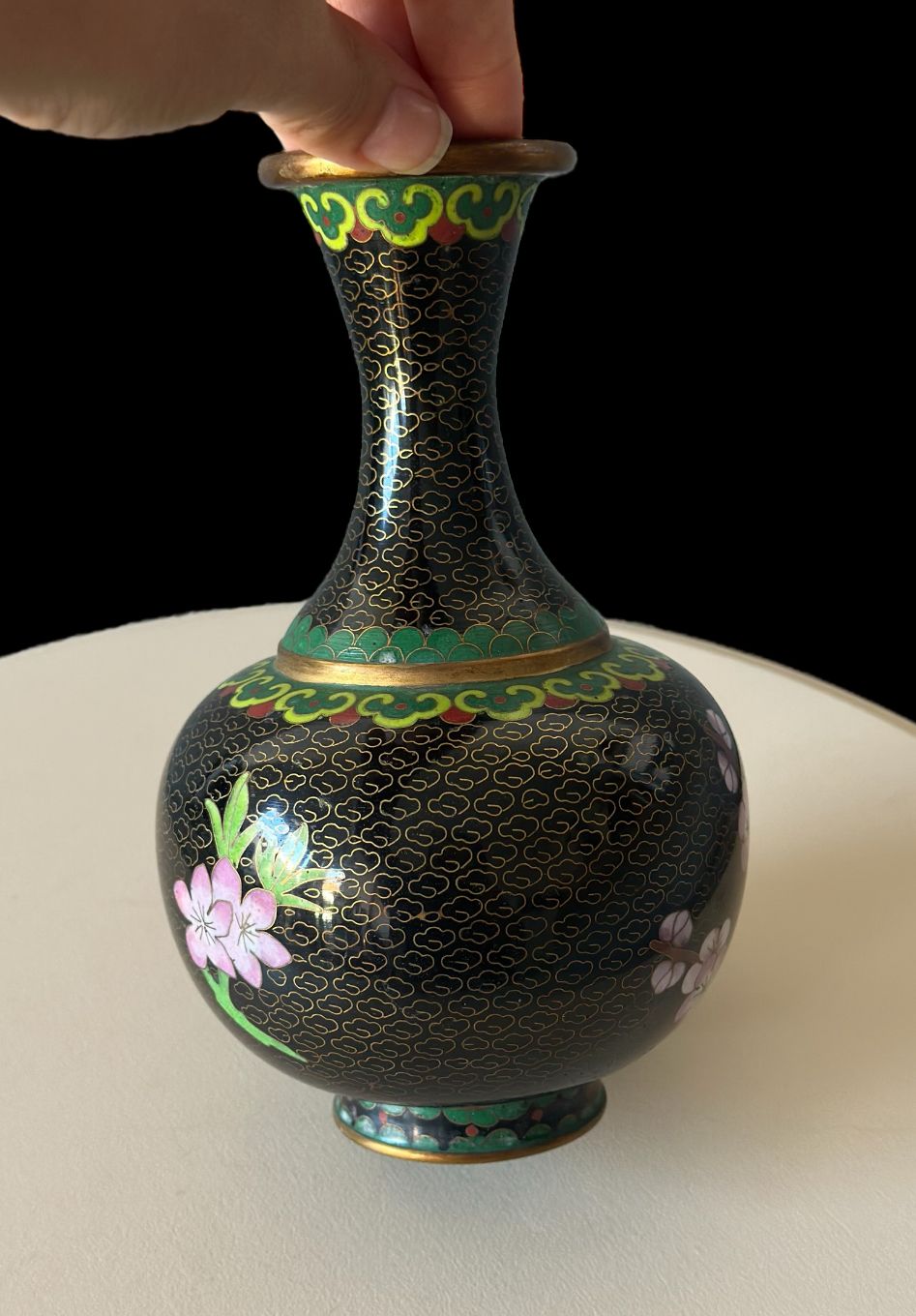 Vintage Black Enamel Cloisonné Bud Vase With Pink Blossom