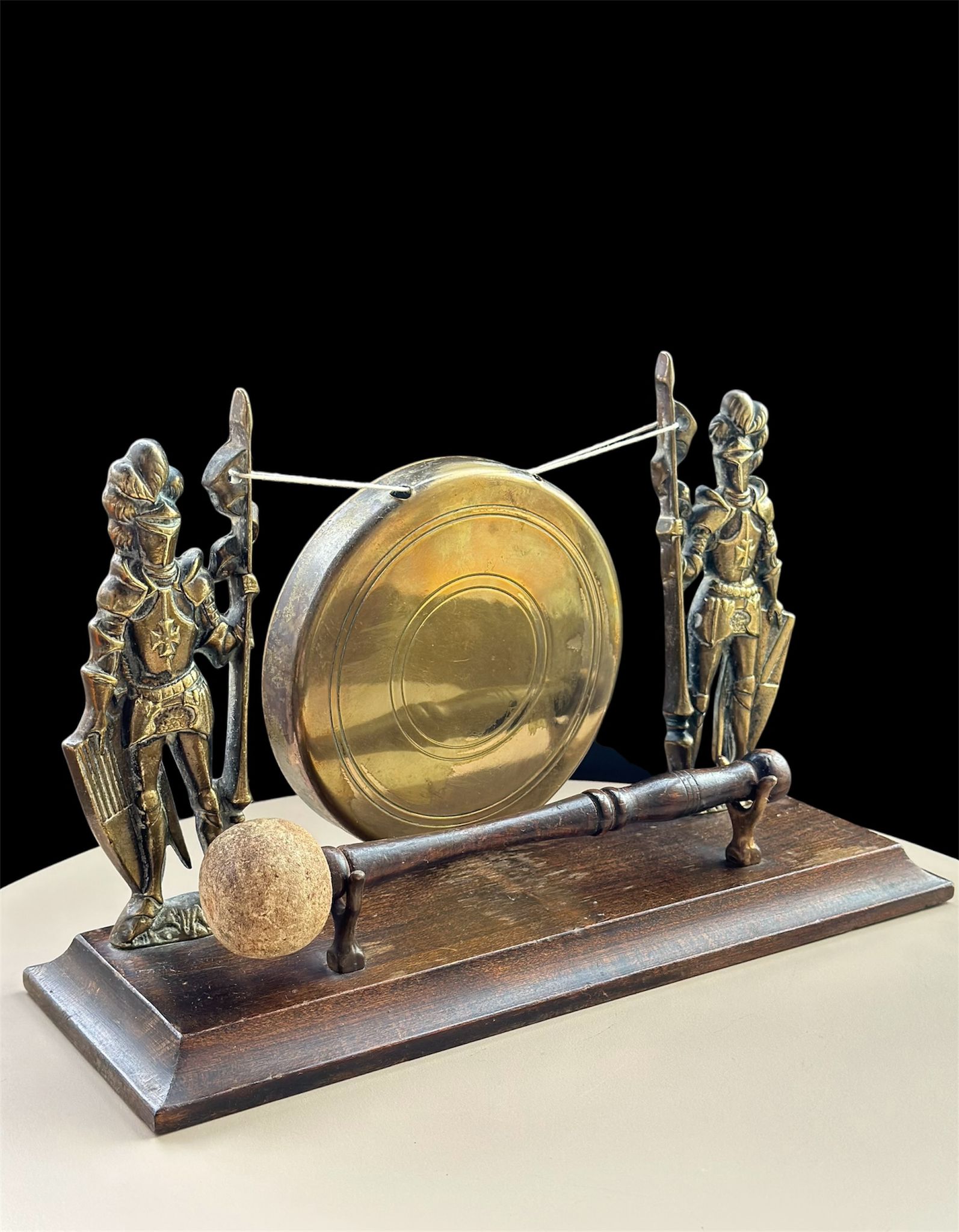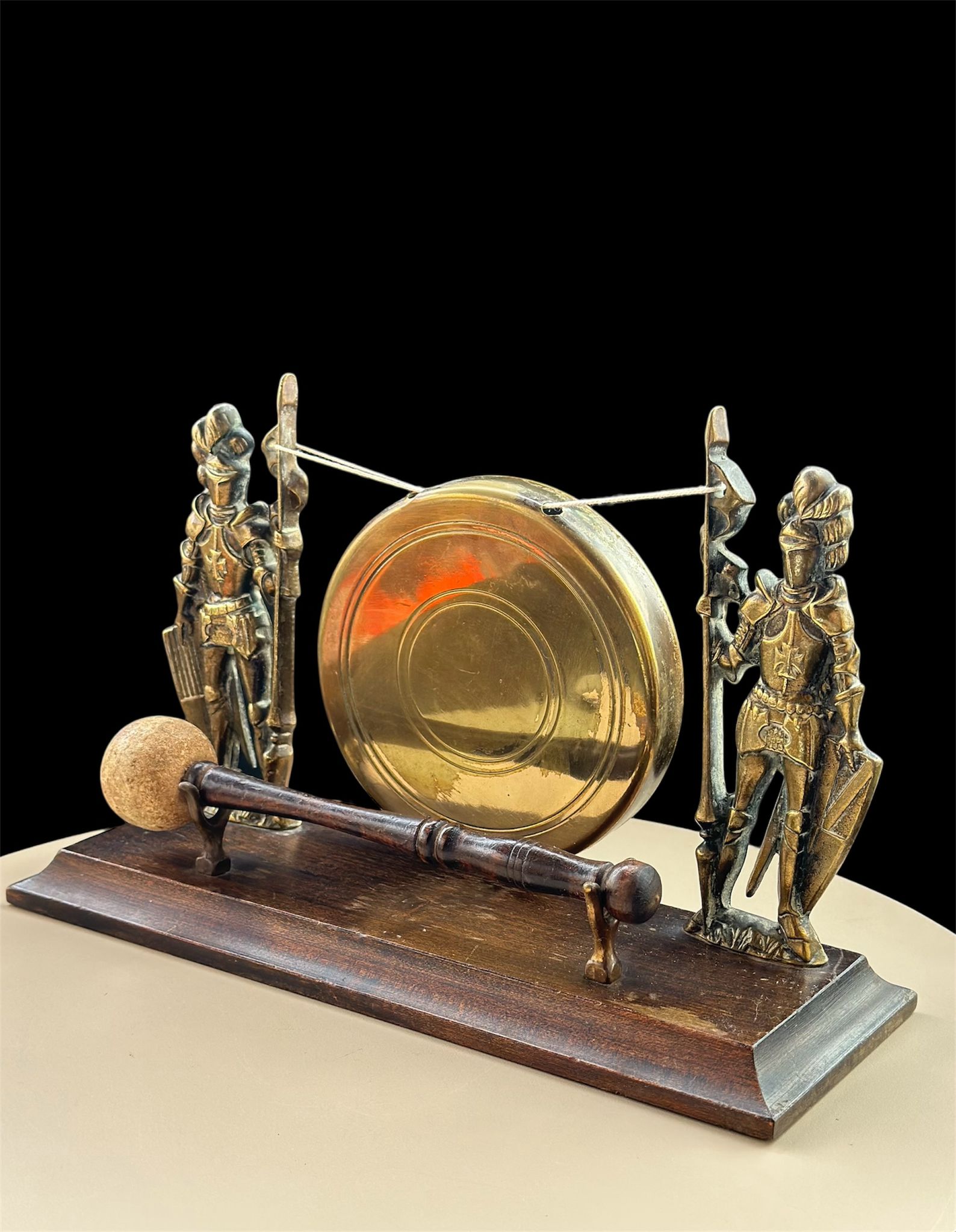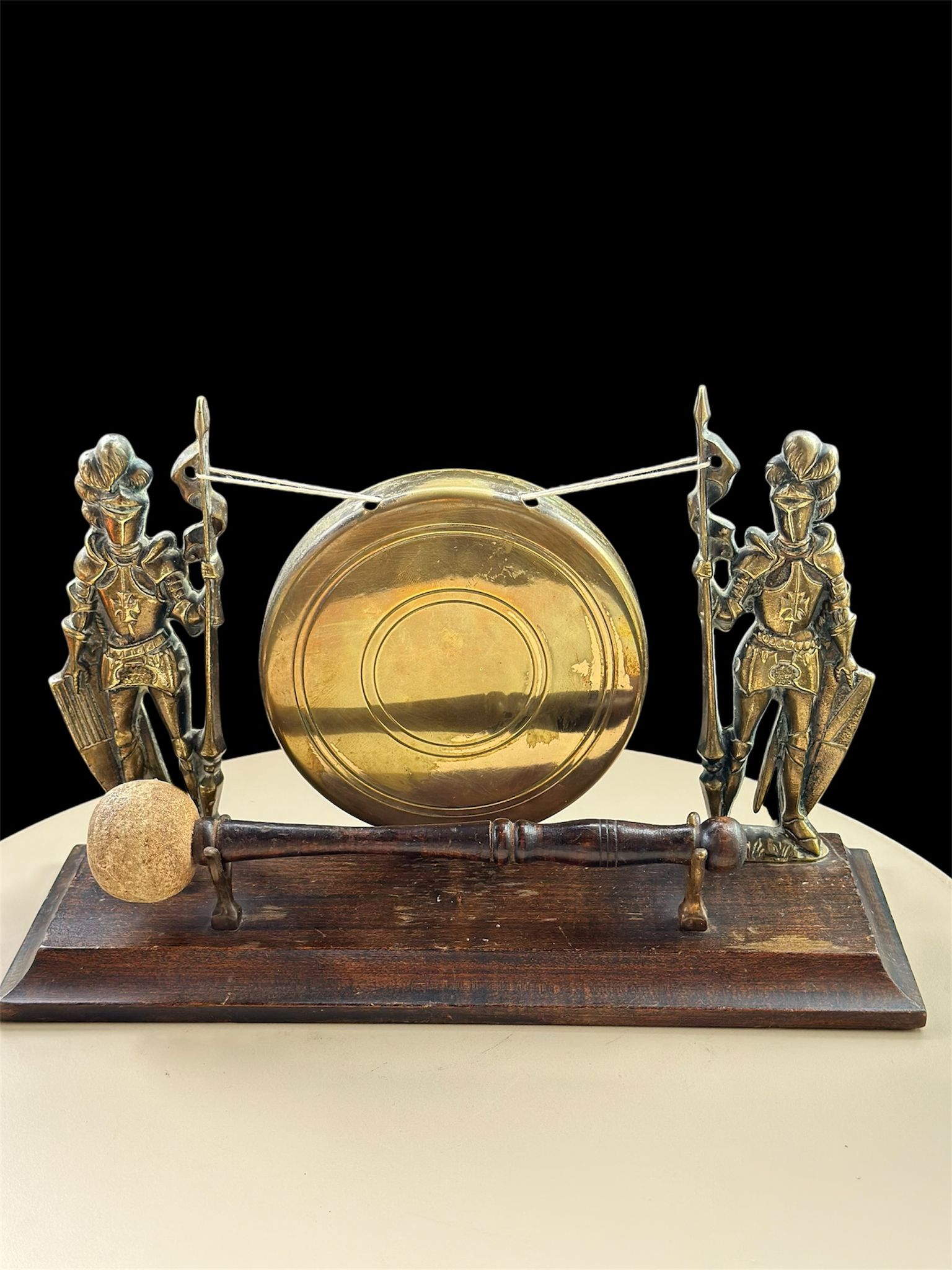 Vintage Brass Knight Warriors Table Gong Bell – Rare Medieval-Style Decor