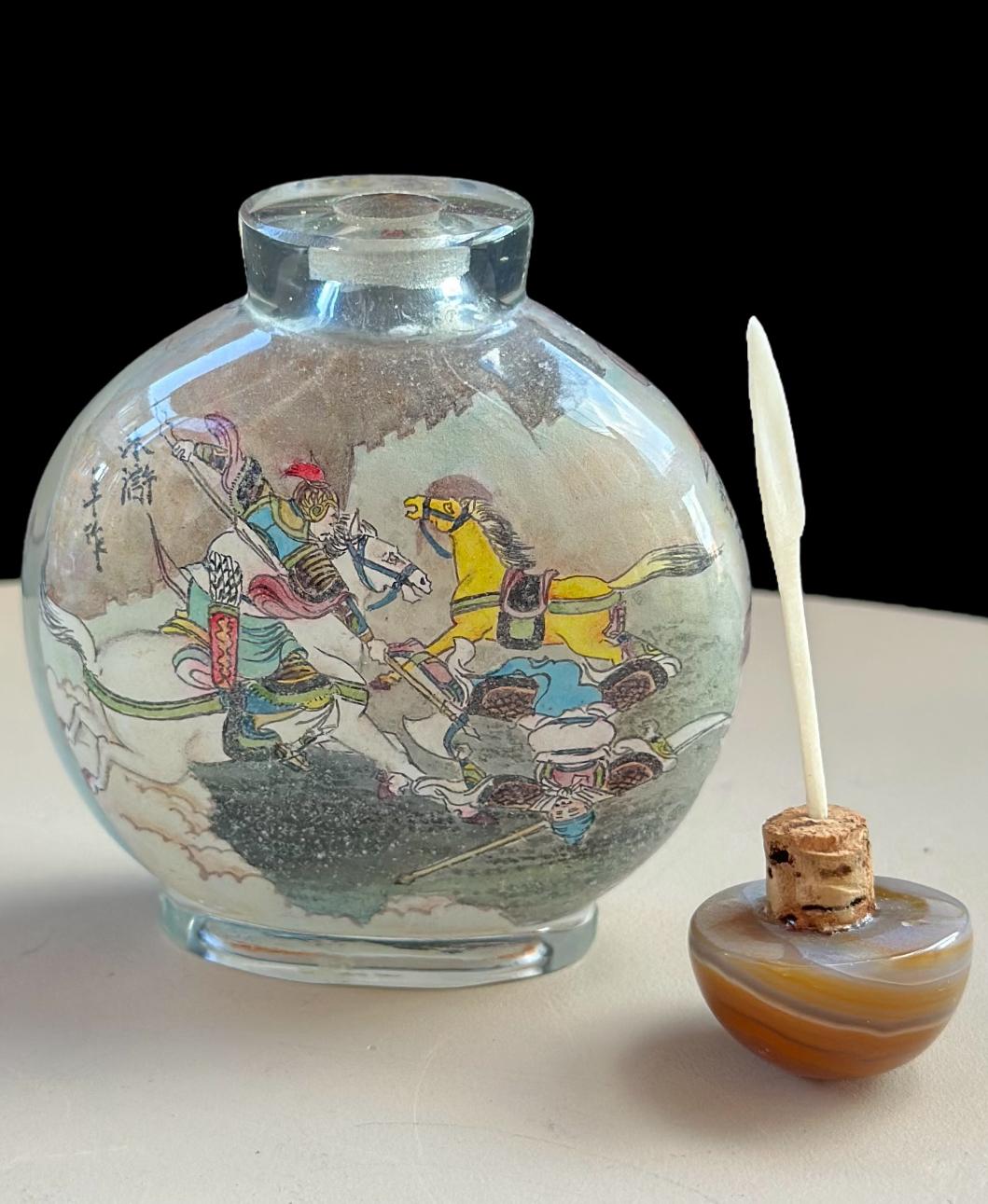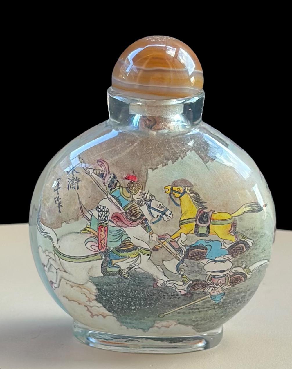 Vintage Chinese Inside-Painted Glass Snuff Bottle – Warrior & Horse Battle Scene – Agate Stopper