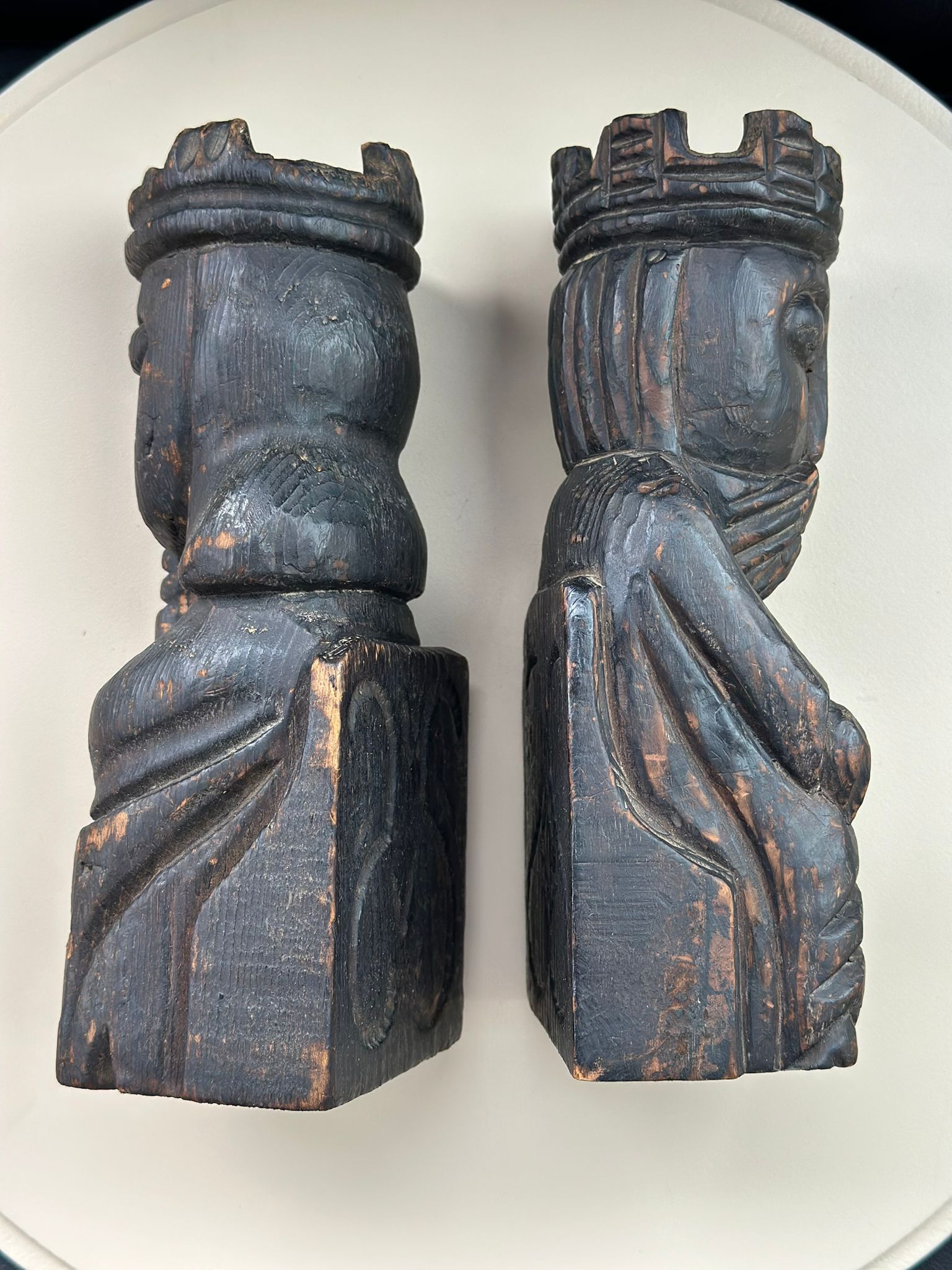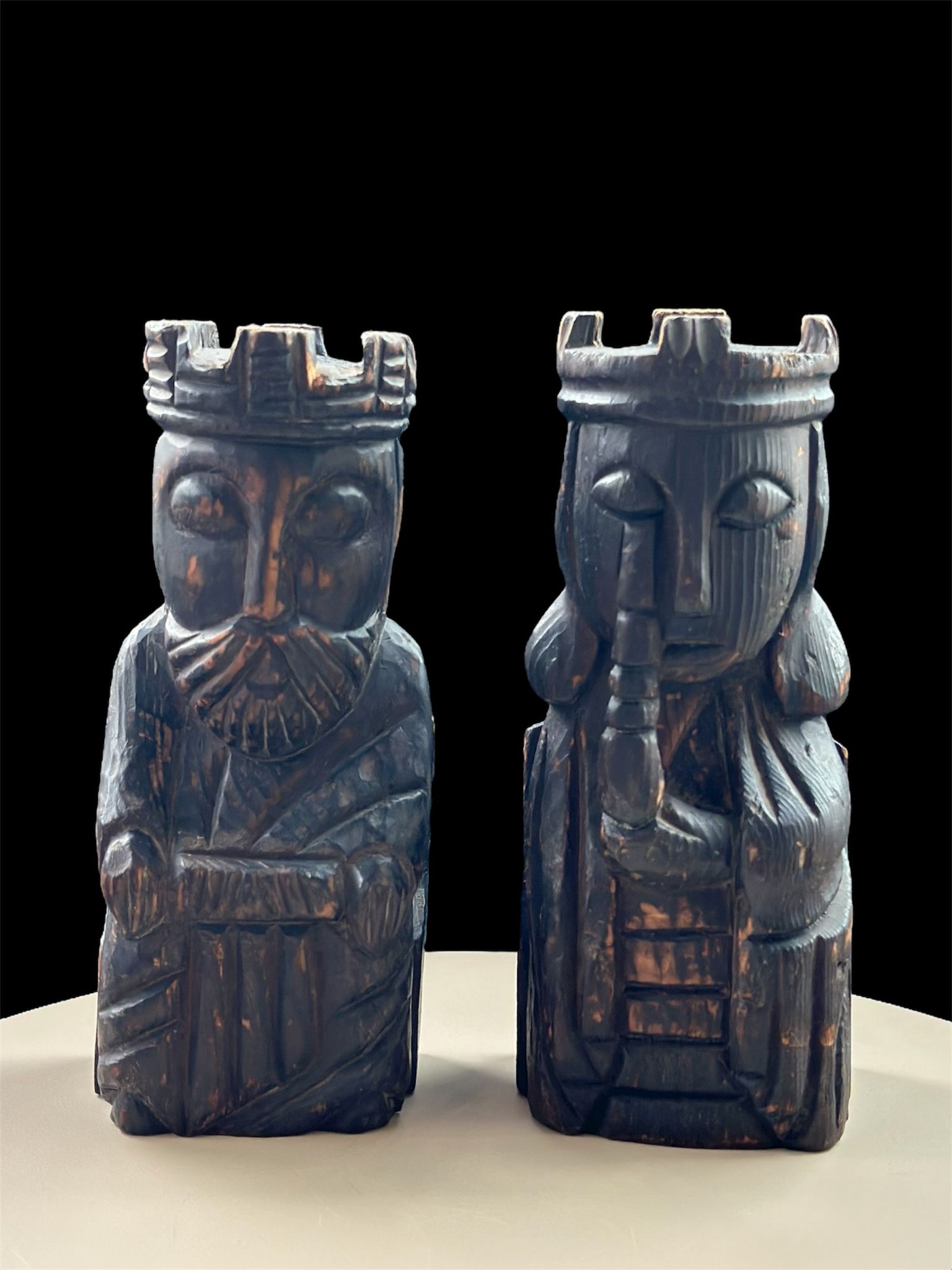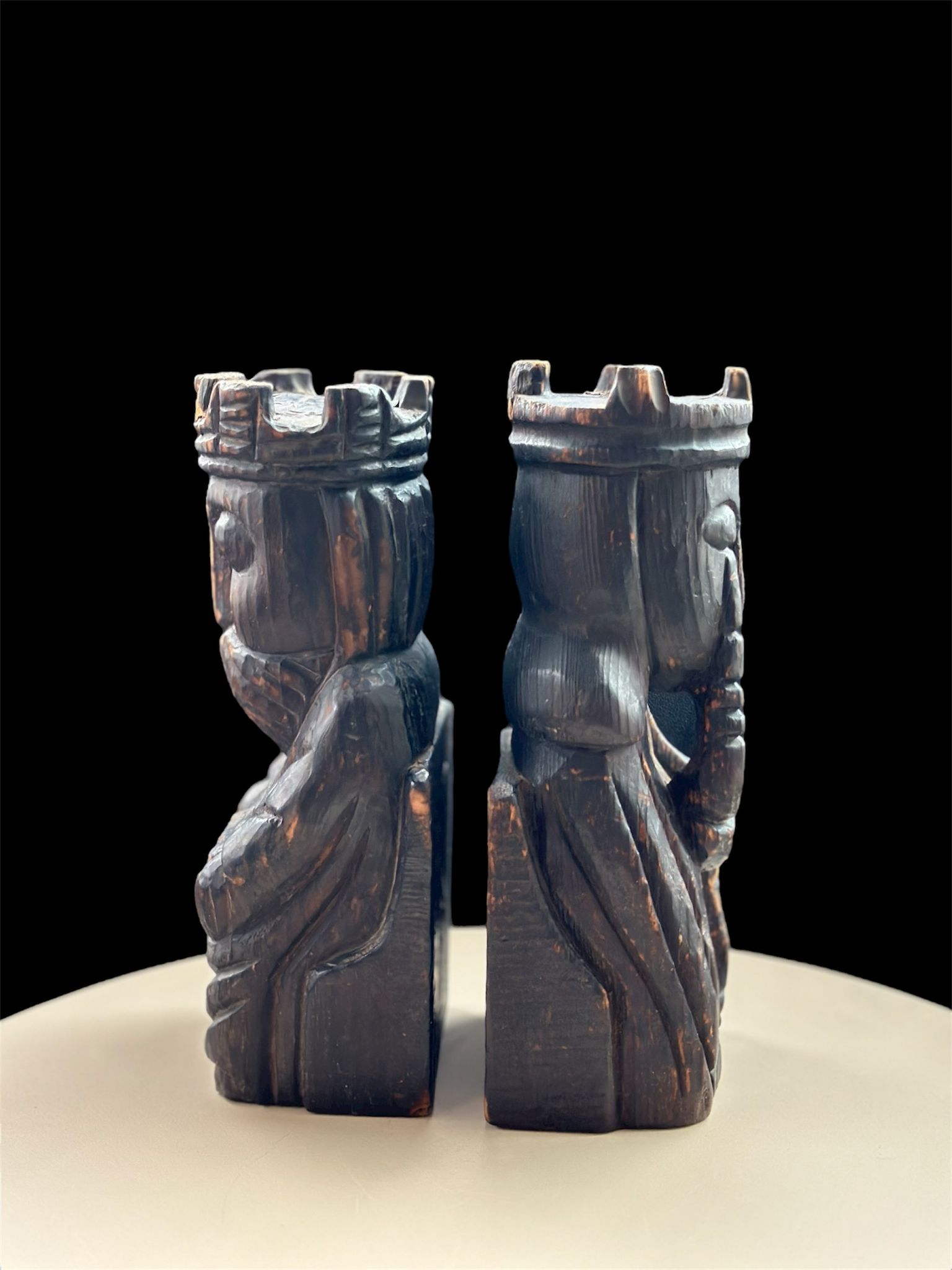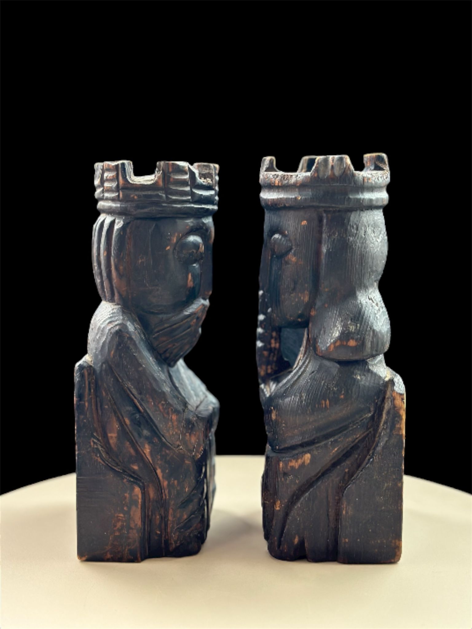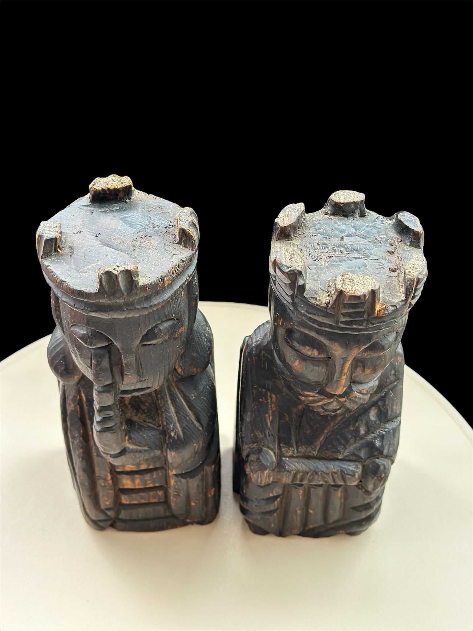 Beautiful pair of vintage hand-carved wooden bookends depicting a King and Queen in a medieval or Norse style, reminiscent of the famous Lewis Chessmen figures. Each piece is made from solid wood and skillfully carved, showing expressive details in the faces, crowns, and robes.