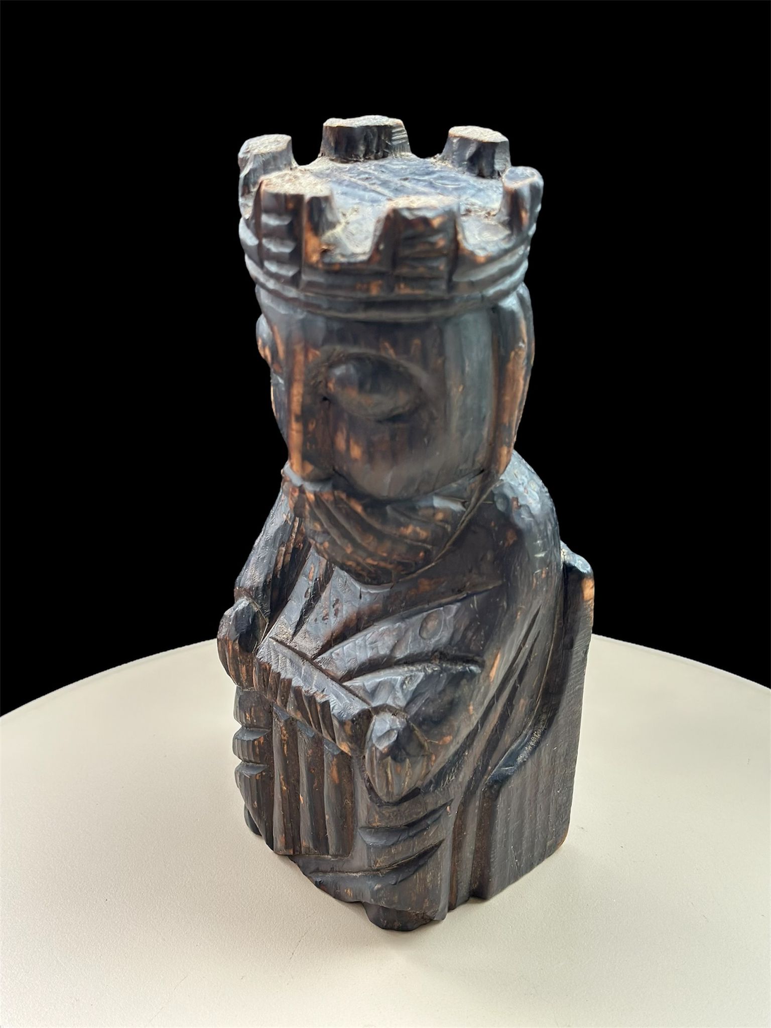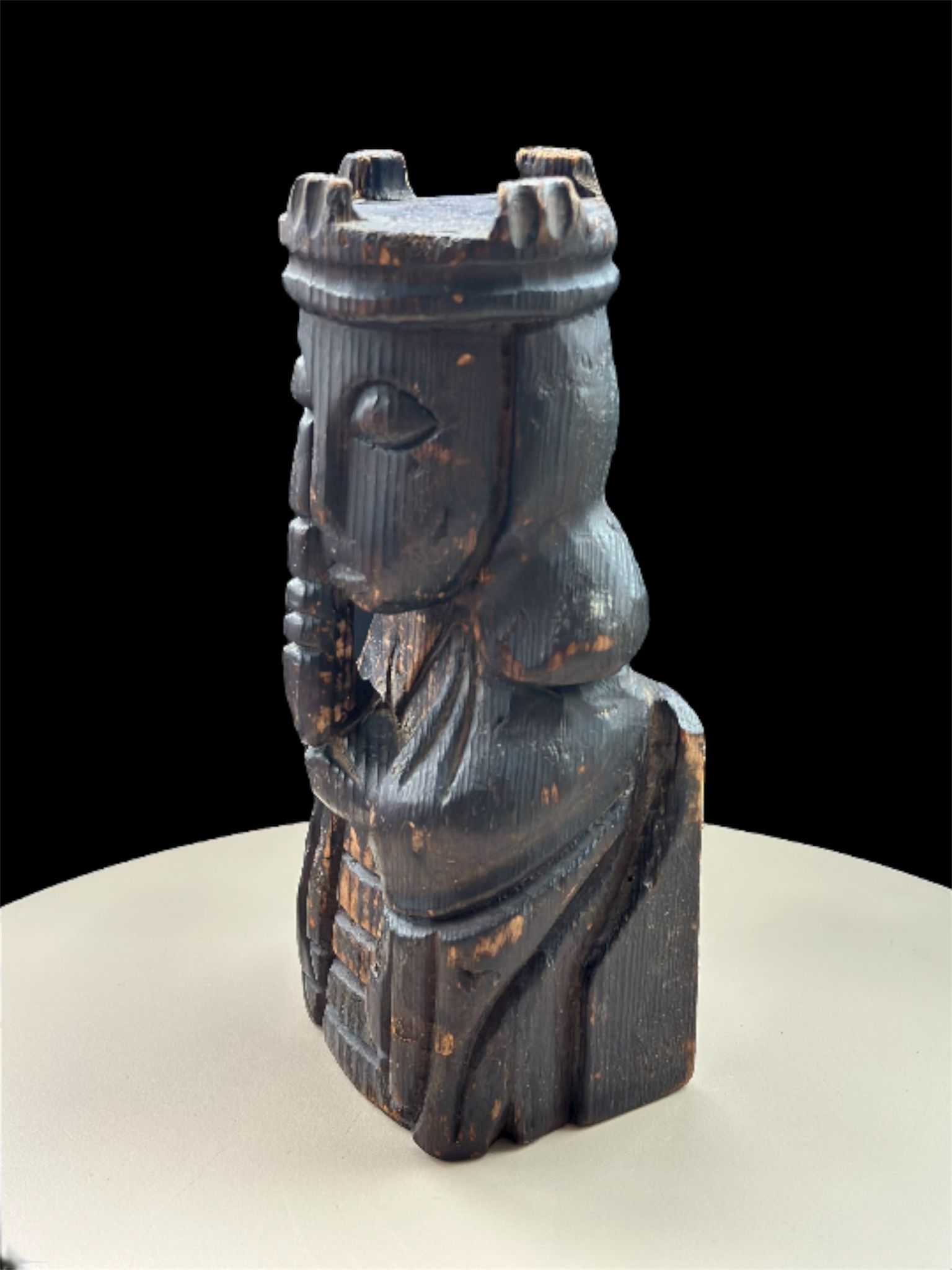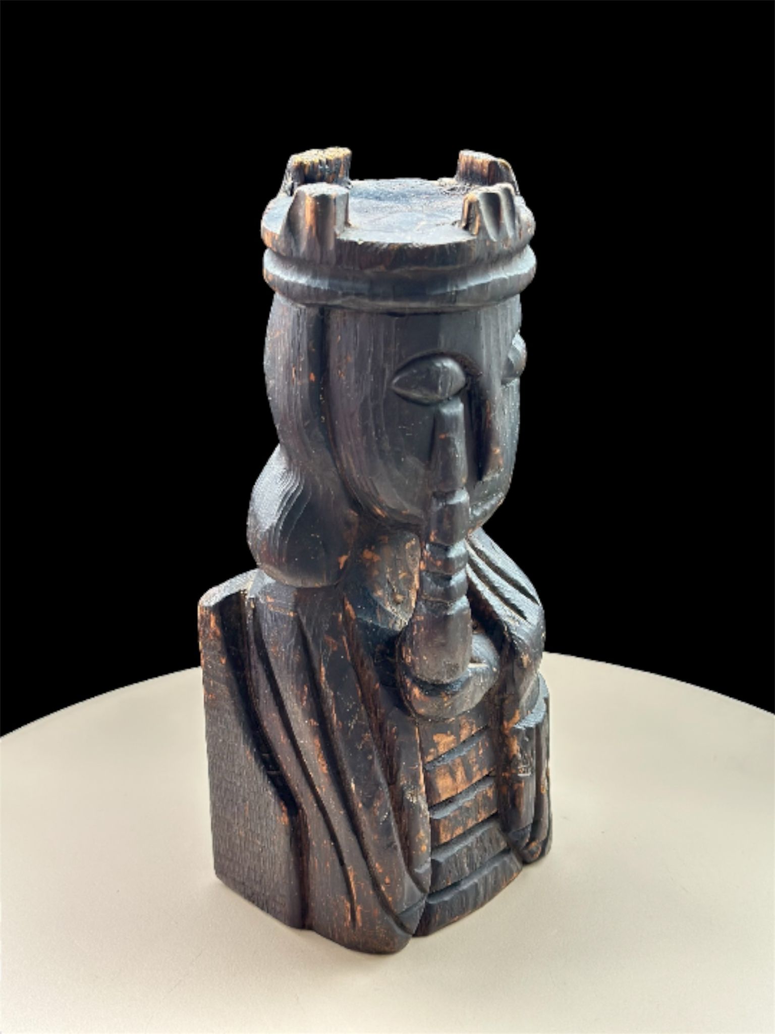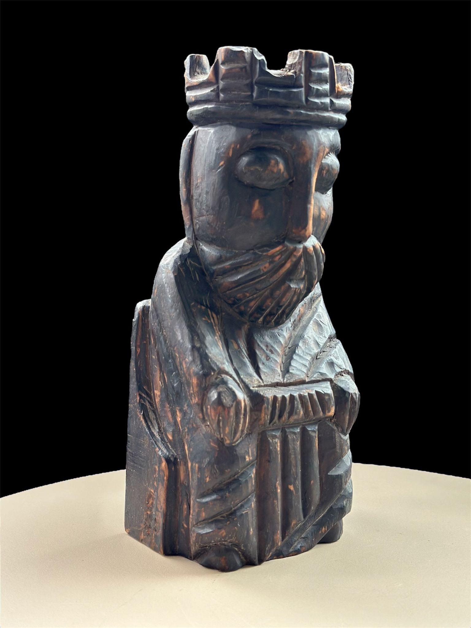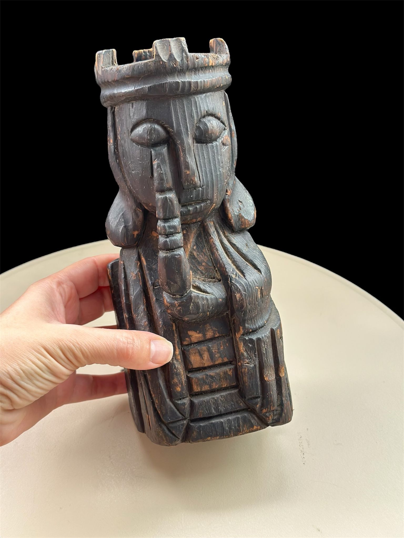 Beautiful pair of vintage hand-carved wooden bookends depicting a King and Queen in a medieval or Norse style, reminiscent of the famous Lewis Chessmen figures. Each piece is made from solid wood and skillfully carved, showing expressive details in the faces, crowns, and robes.