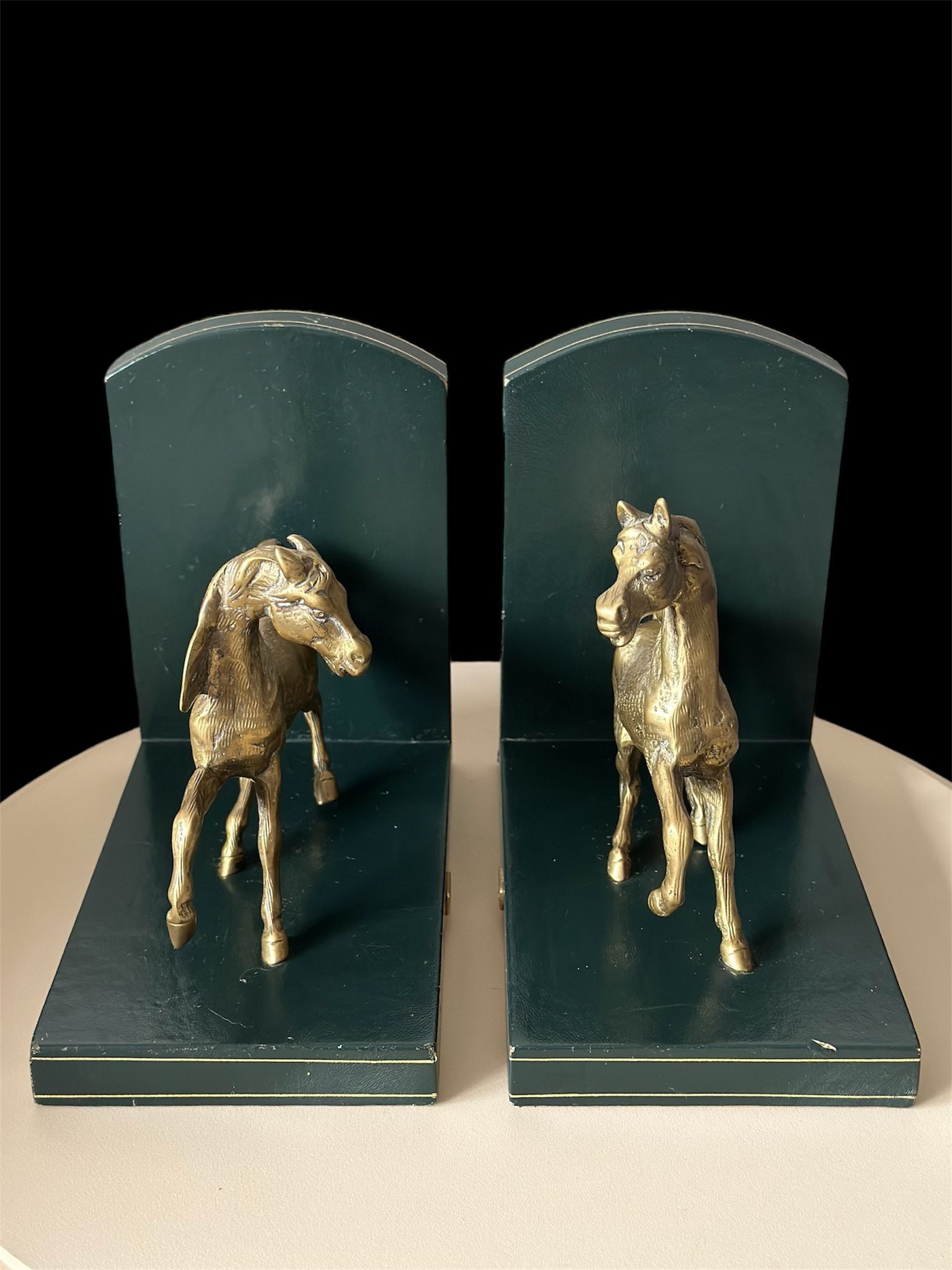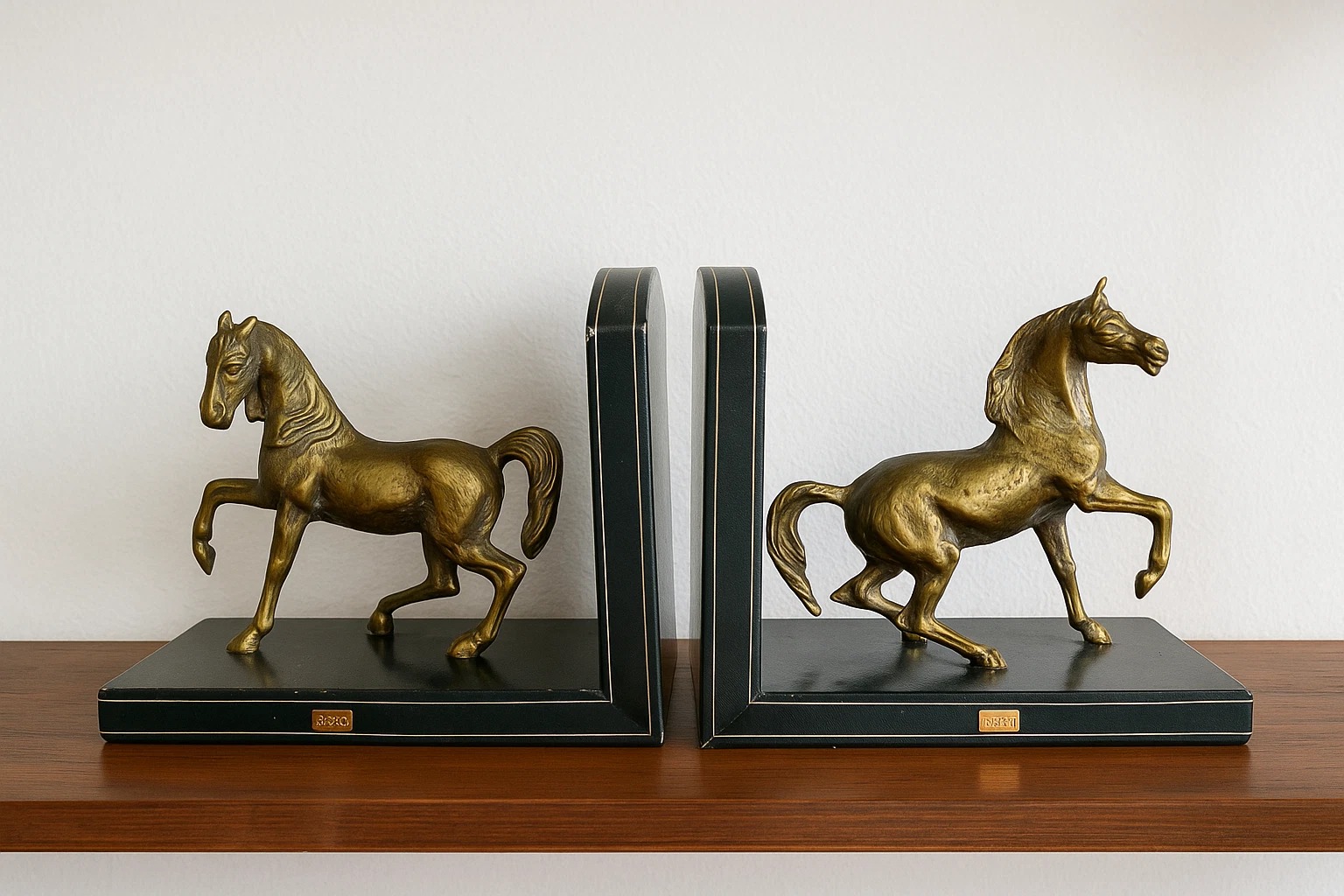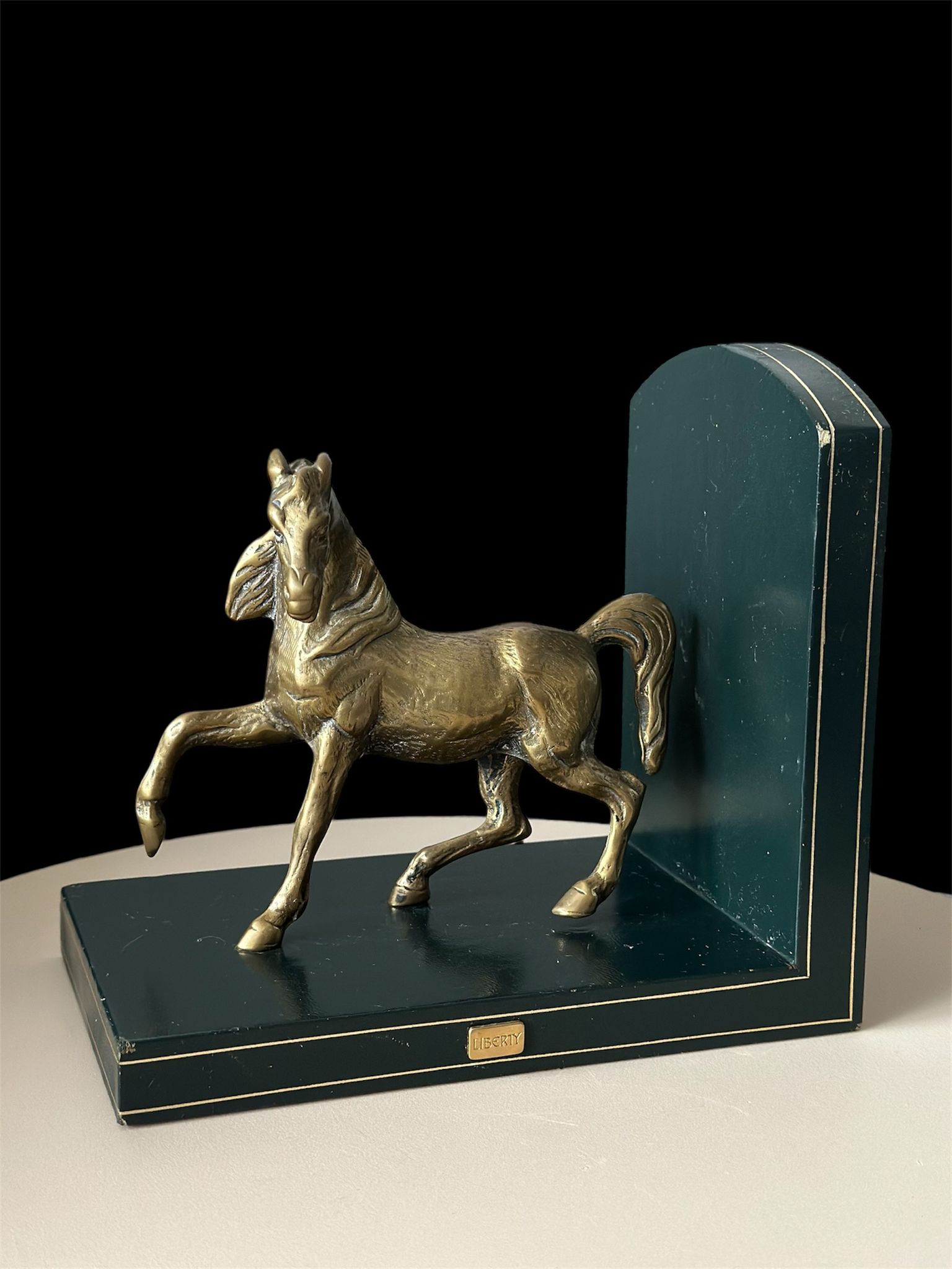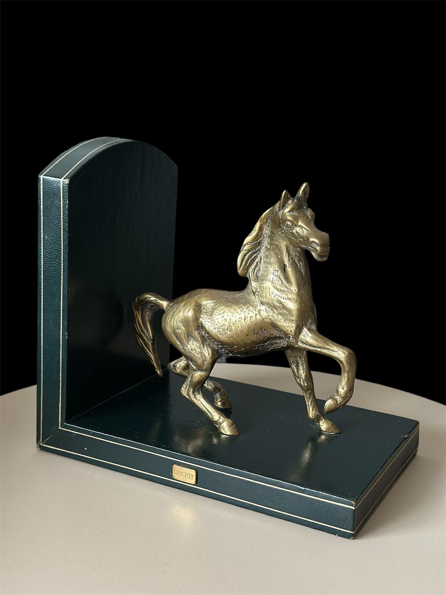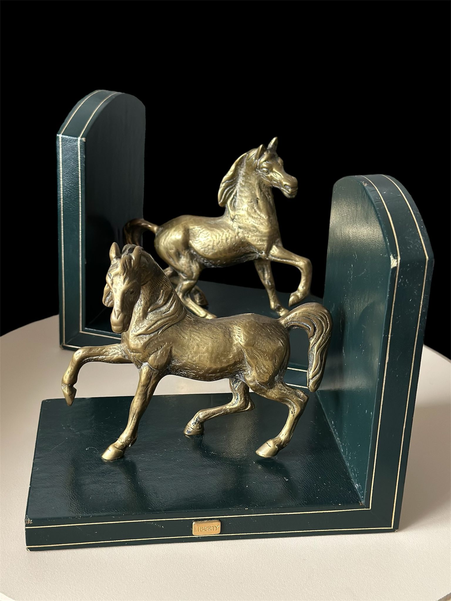 Elegant pair of vintage Liberty of London horse bookends, featuring finely detailed brass horses mounted on genuine Italian leather bases. These luxurious decorative pieces combine craftsmanship and timeless equestrian charm — a perfect addition to any sophisticated library, study, or office.
