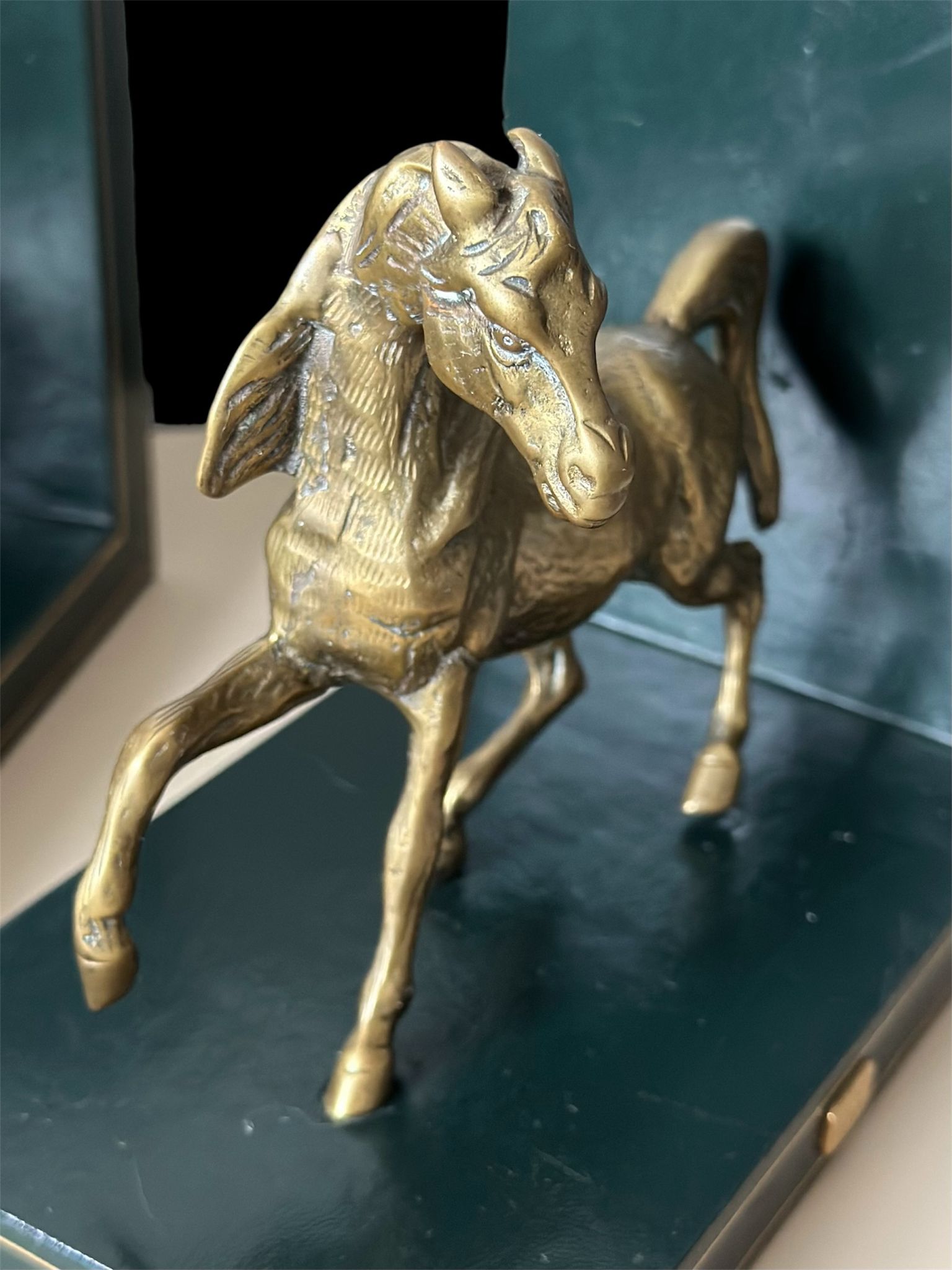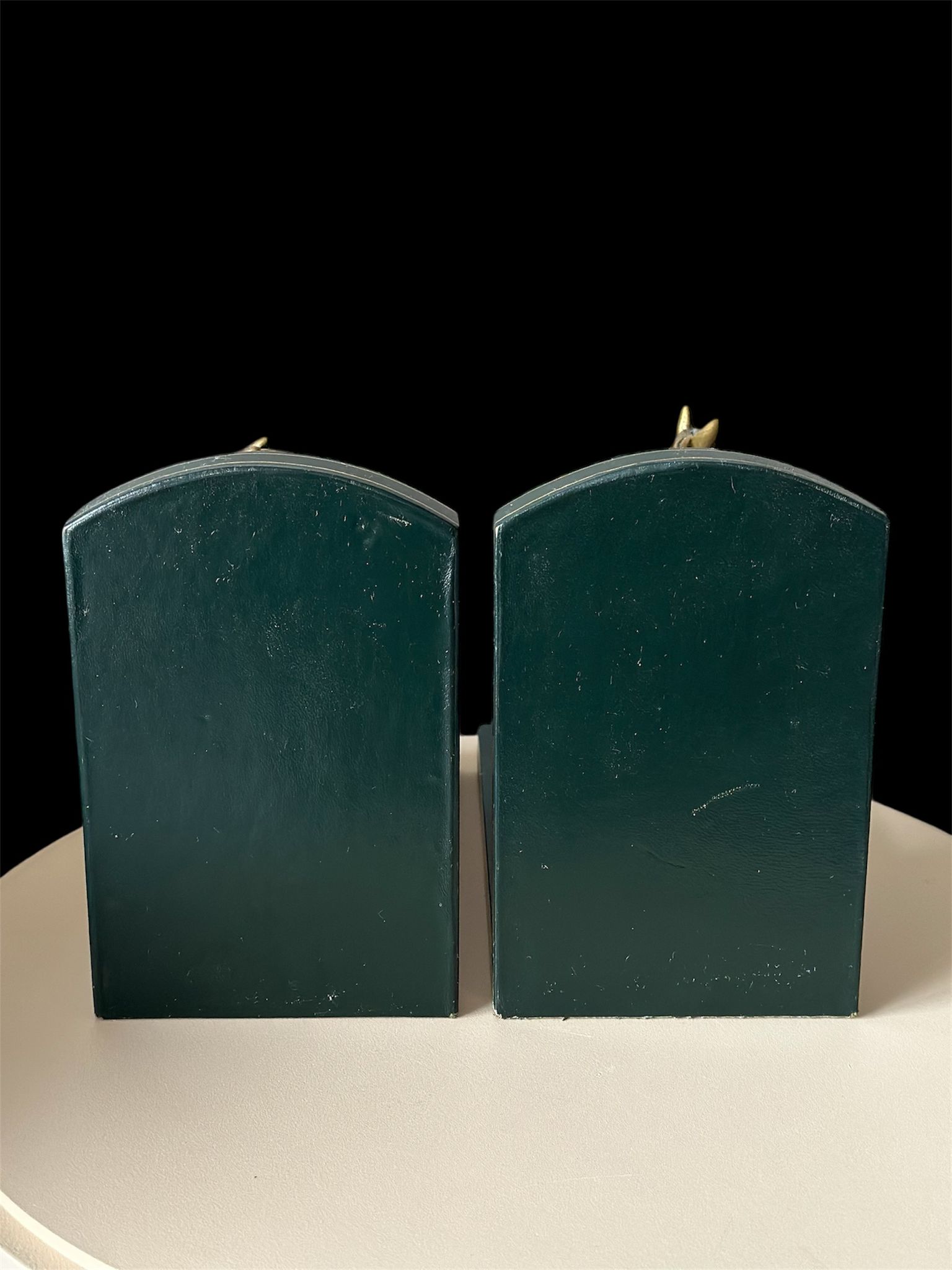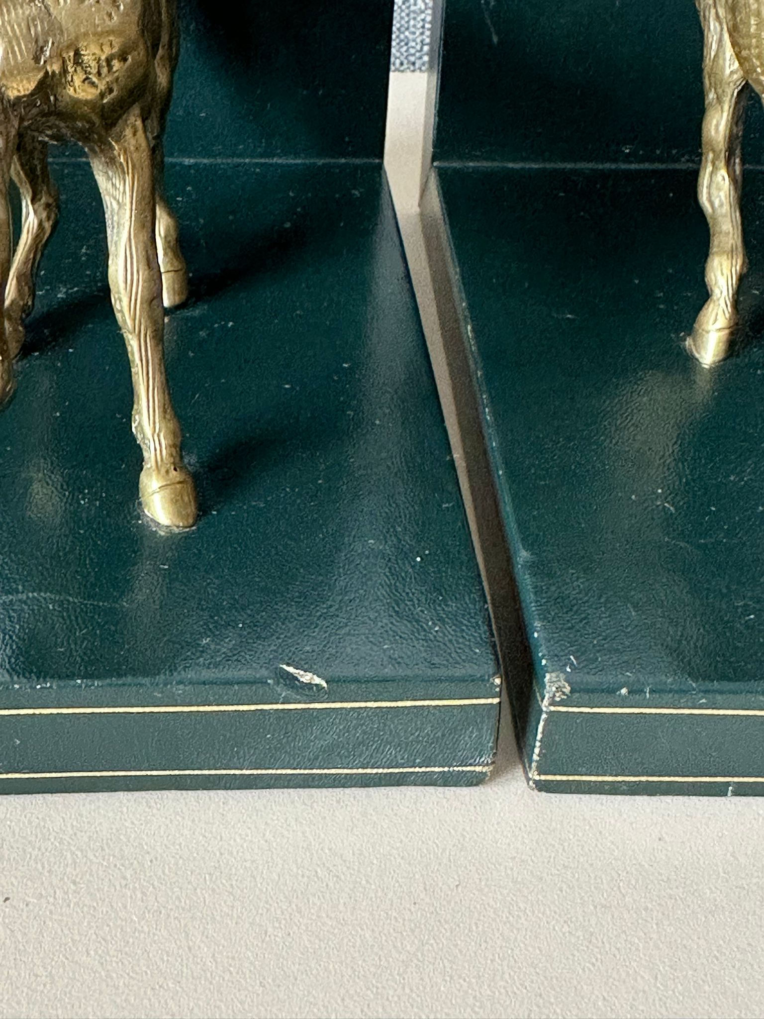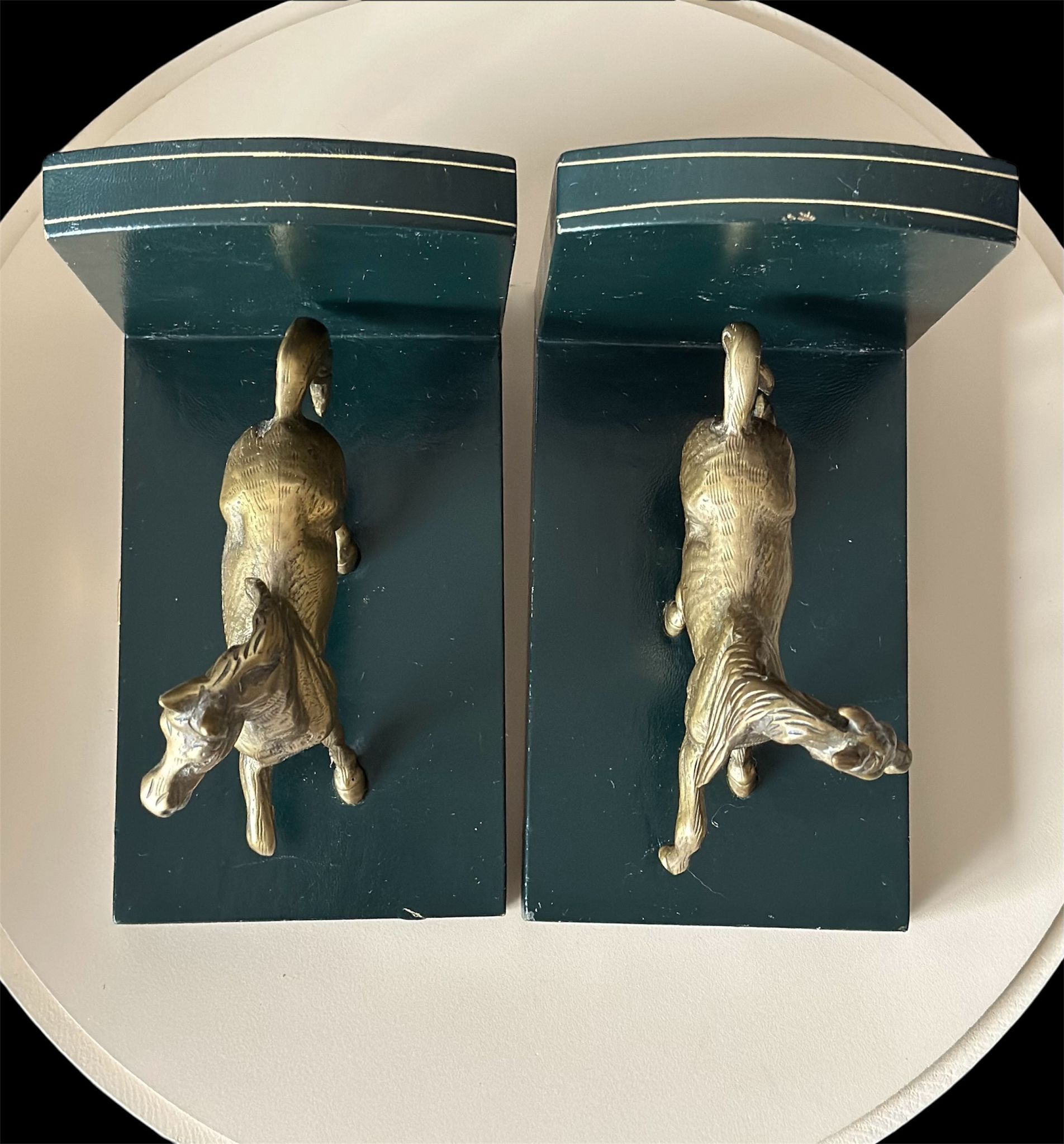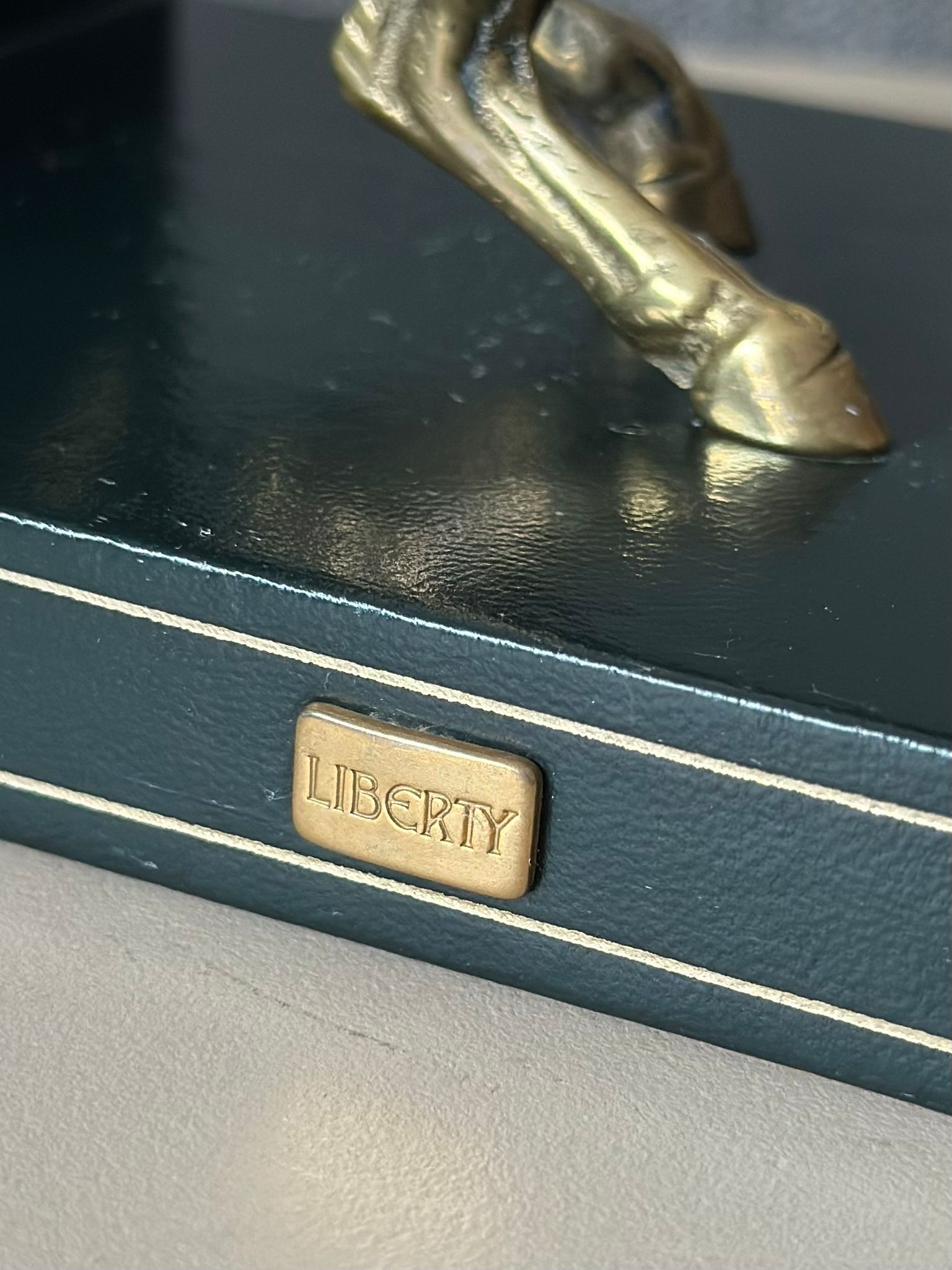 Elegant pair of vintage Liberty of London horse bookends, featuring finely detailed brass horses mounted on genuine Italian leather bases. These luxurious decorative pieces combine craftsmanship and timeless equestrian charm — a perfect addition to any sophisticated library, study, or office.